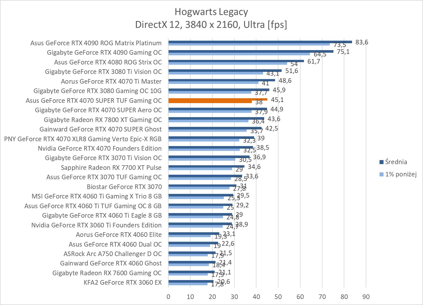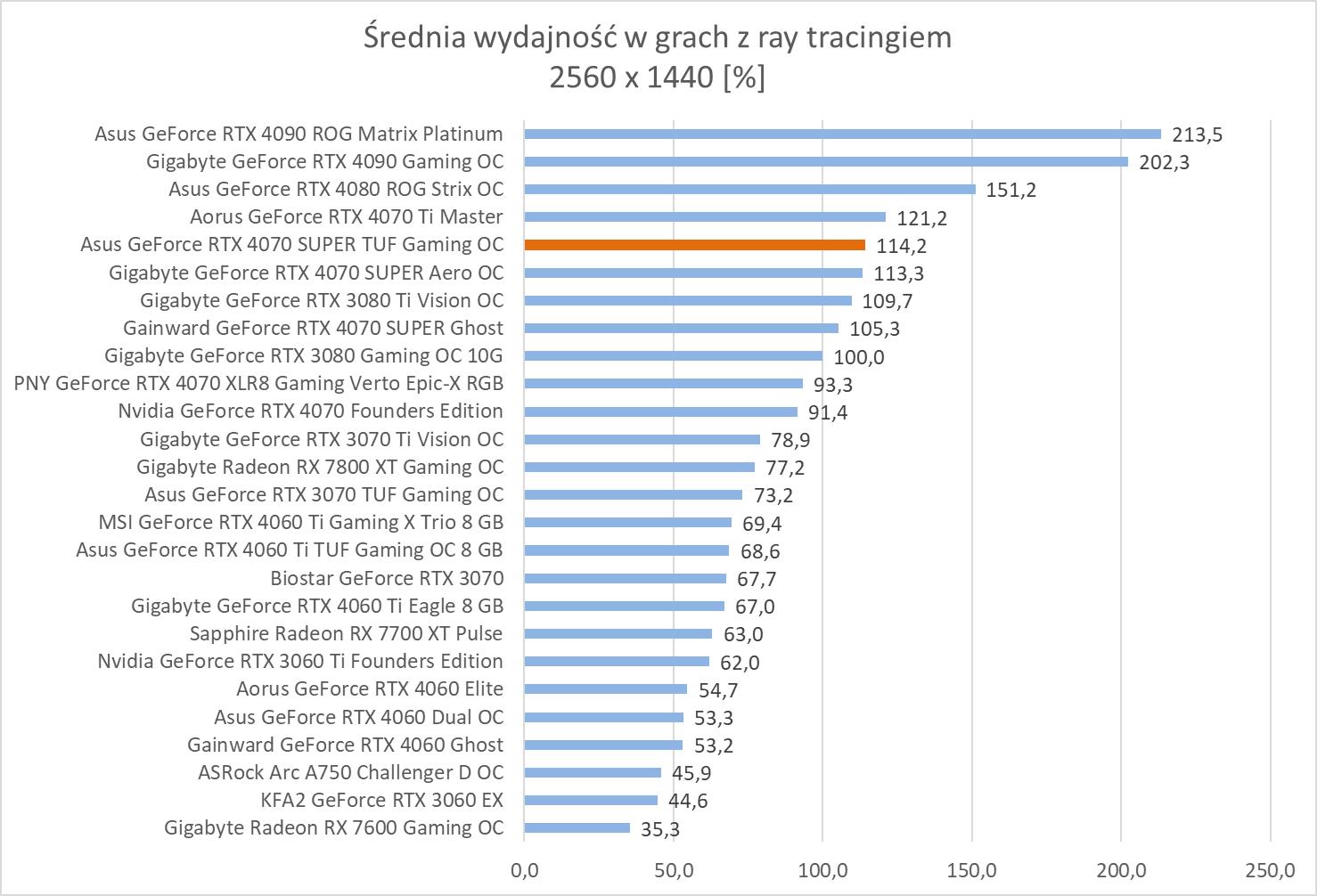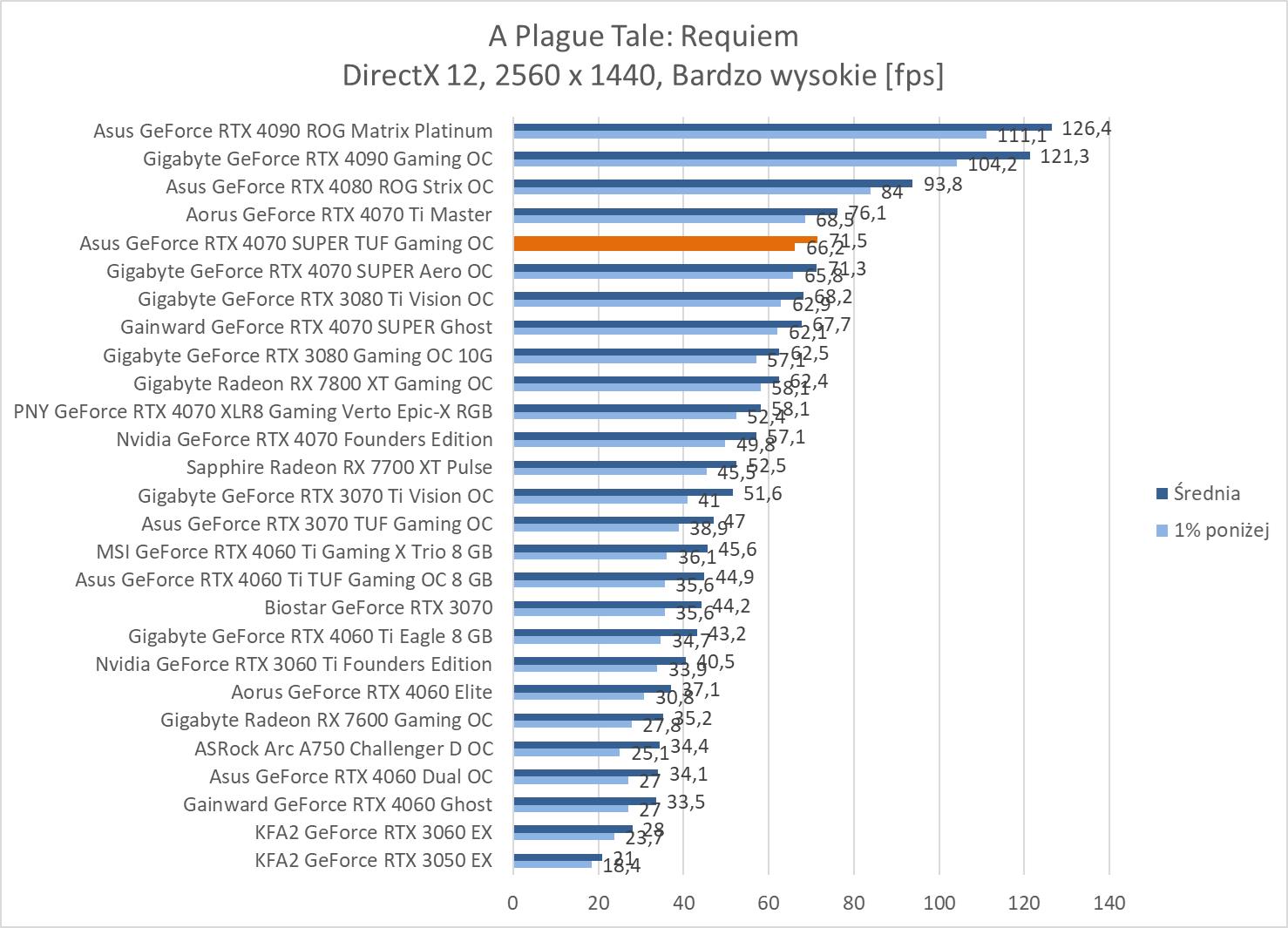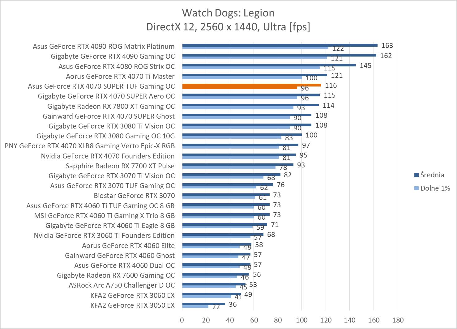 W 2560 x 1440 wszystko zależy od gry. Karta Asus GeForce RTX 4070 SUPER TUF Gaming OC zapewnia ponad 60 fps w mniej wymagających grach, ale w Hogwarts Legacy czy Cyberpunk 2077 wyniki są już niższe.