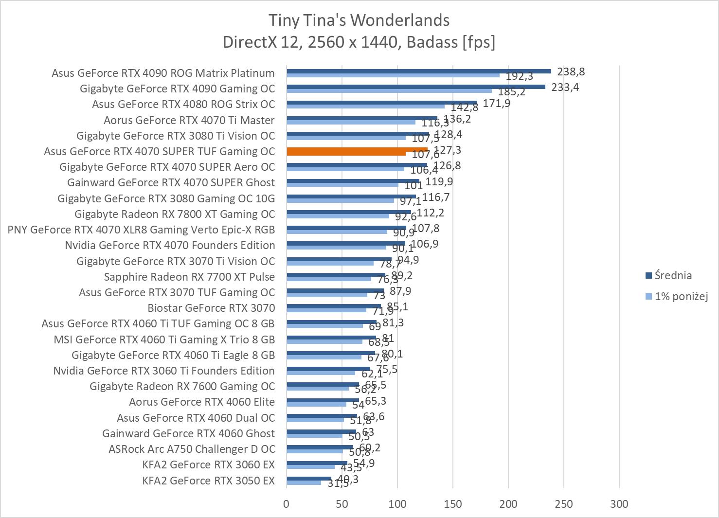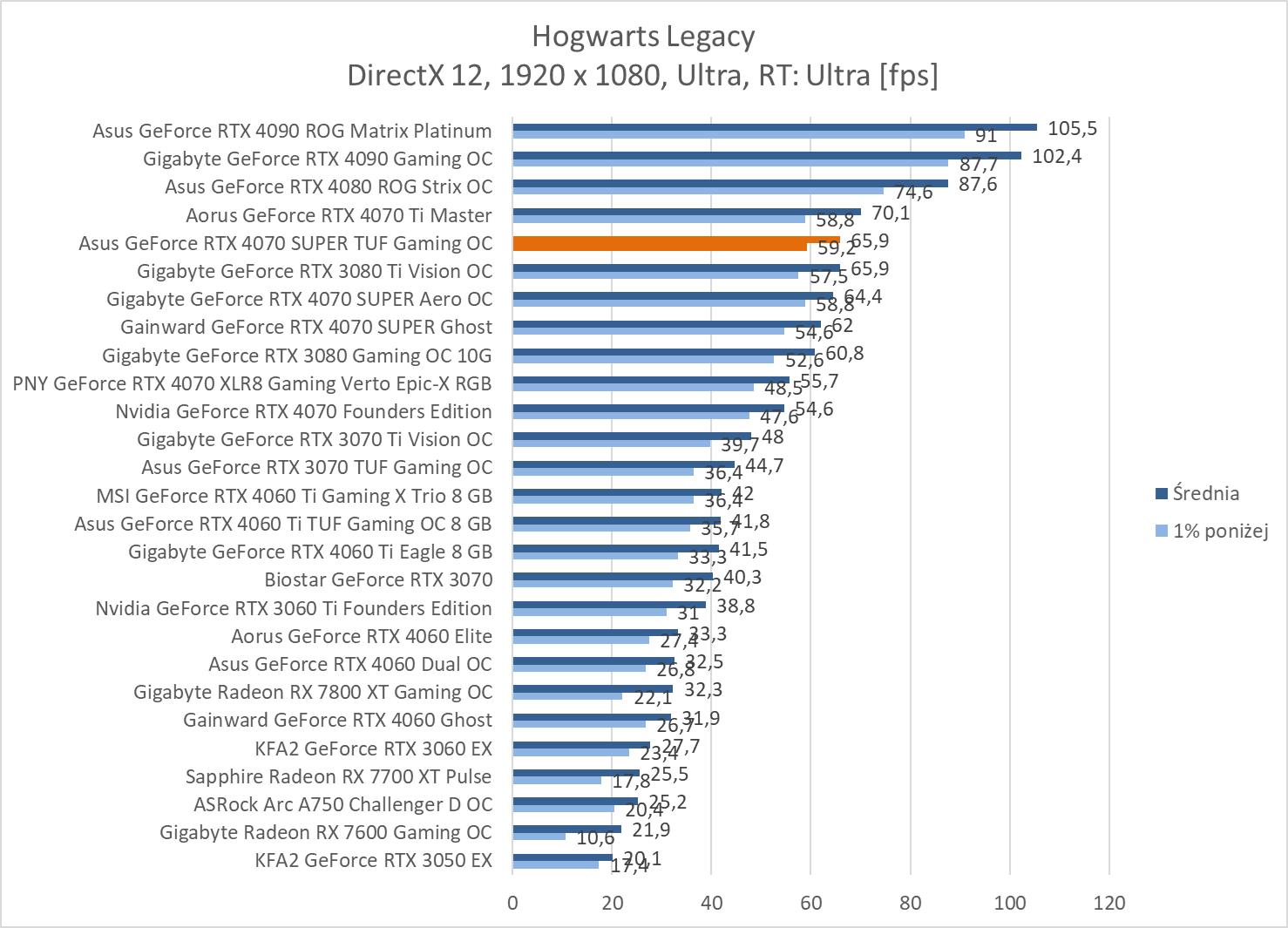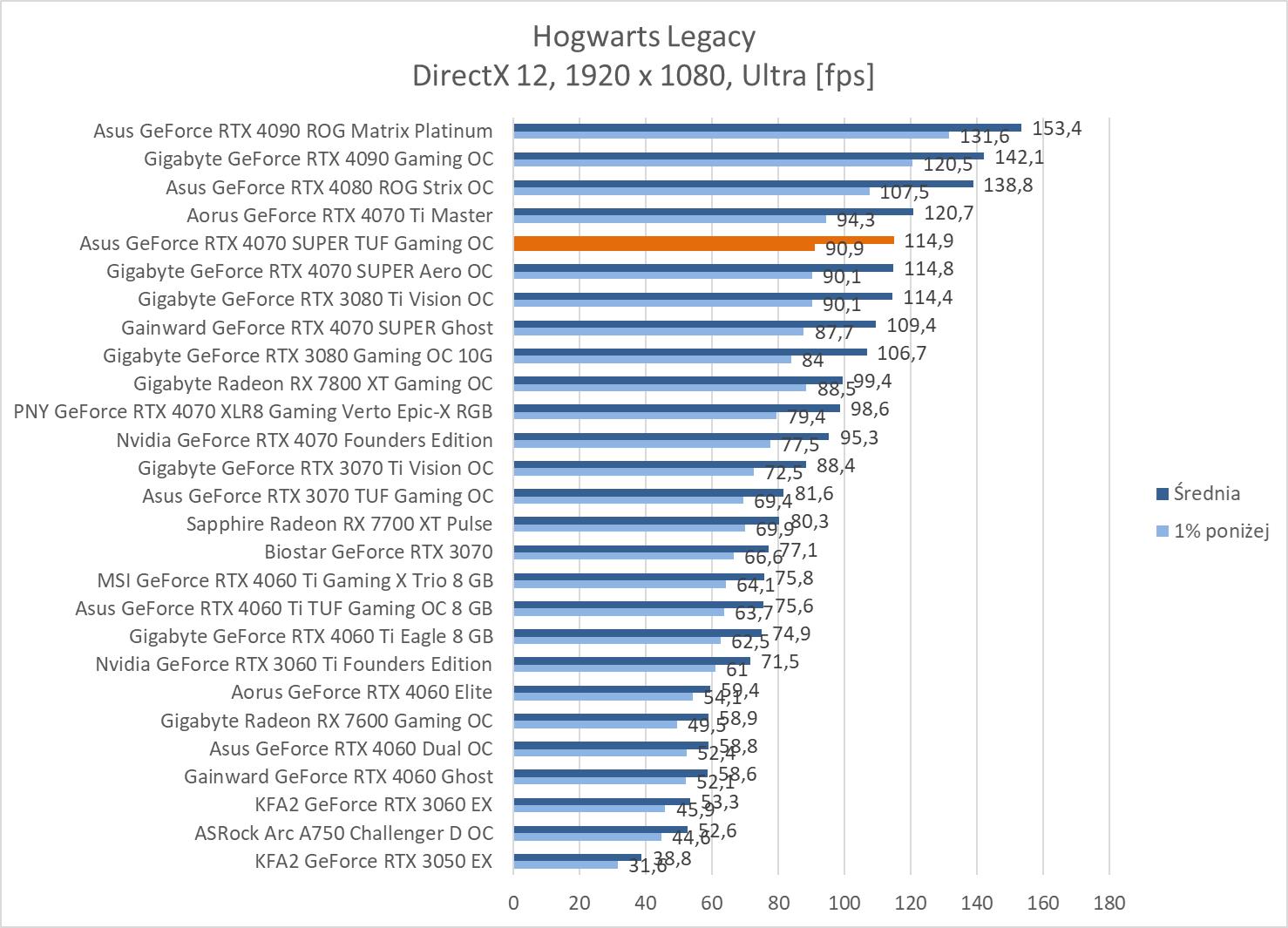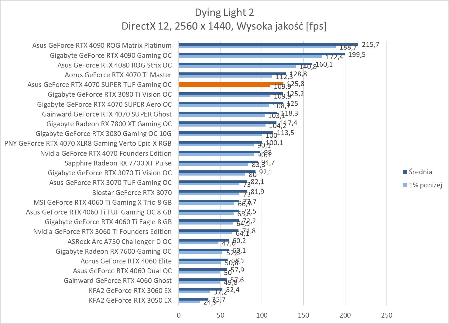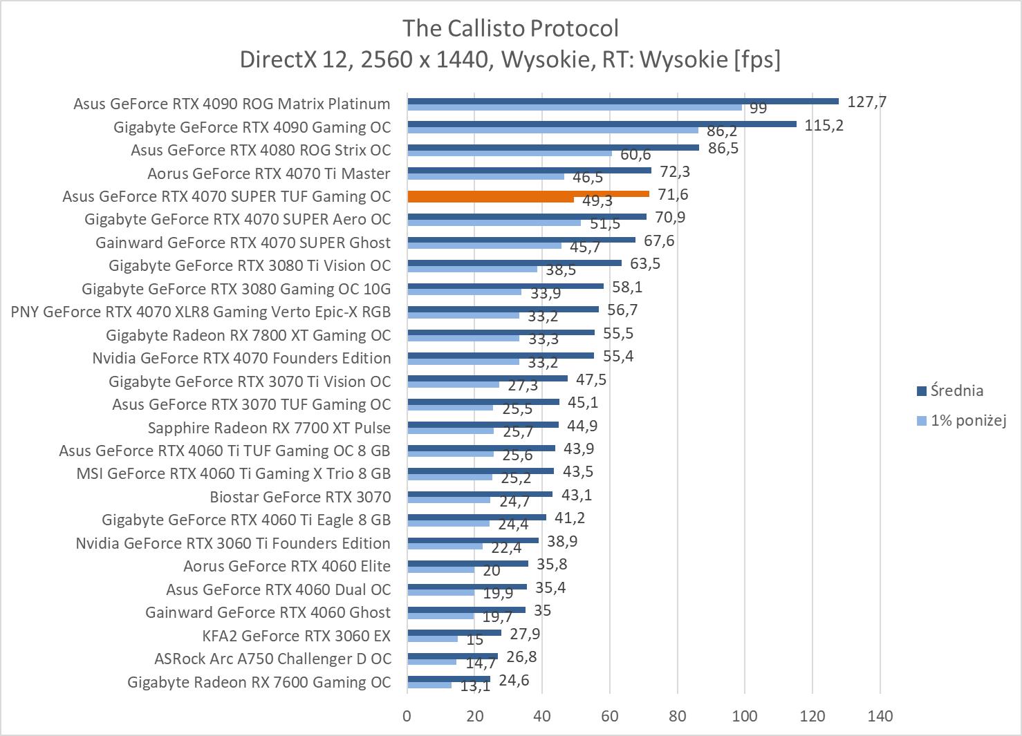 W 2560 x 1440 wszystko zależy od gry. Karta Asus GeForce RTX 4070 SUPER TUF Gaming OC zapewnia ponad 60 fps w mniej wymagających grach, ale w Hogwarts Legacy czy Cyberpunk 2077 wyniki są już niższe.