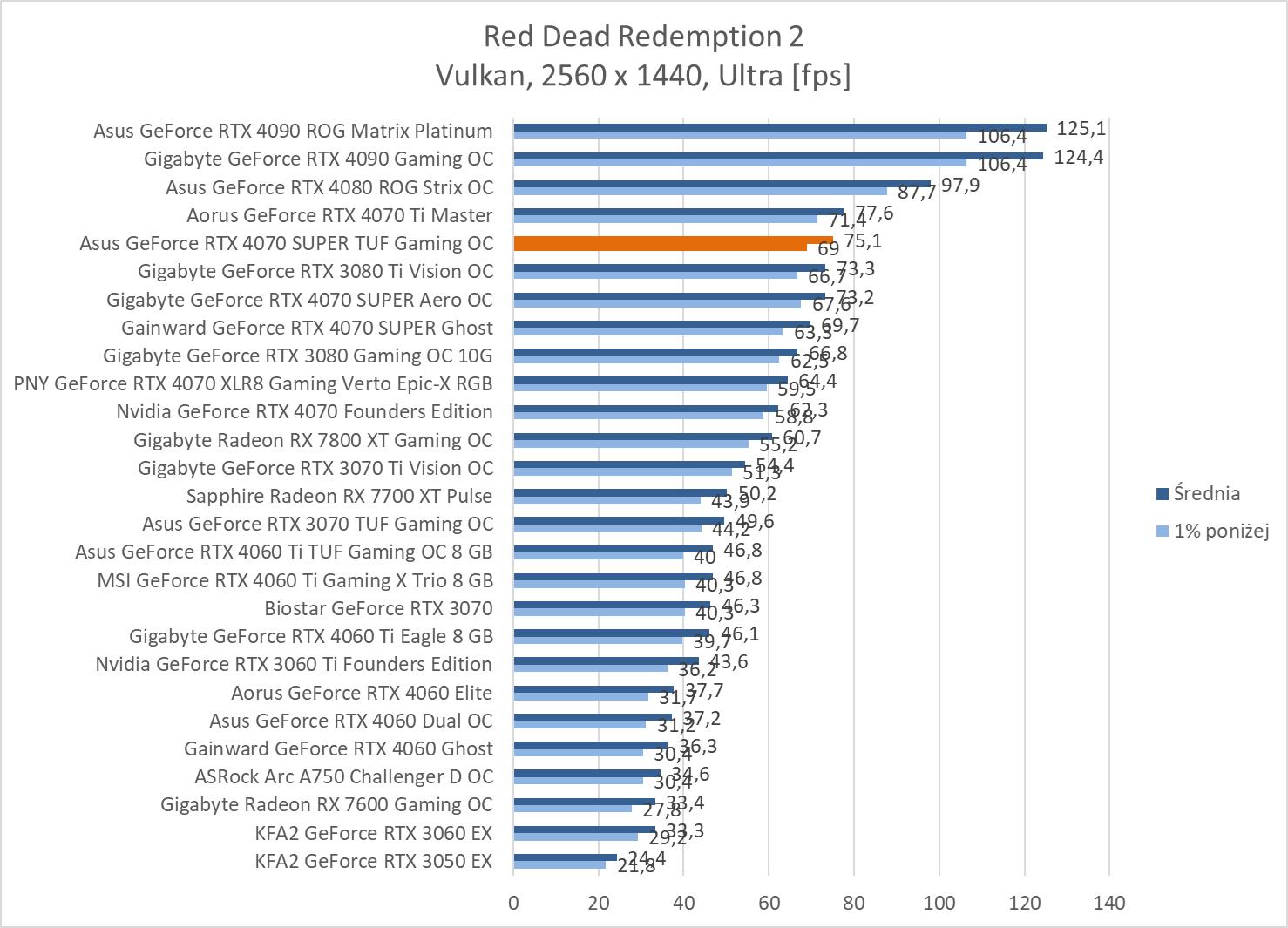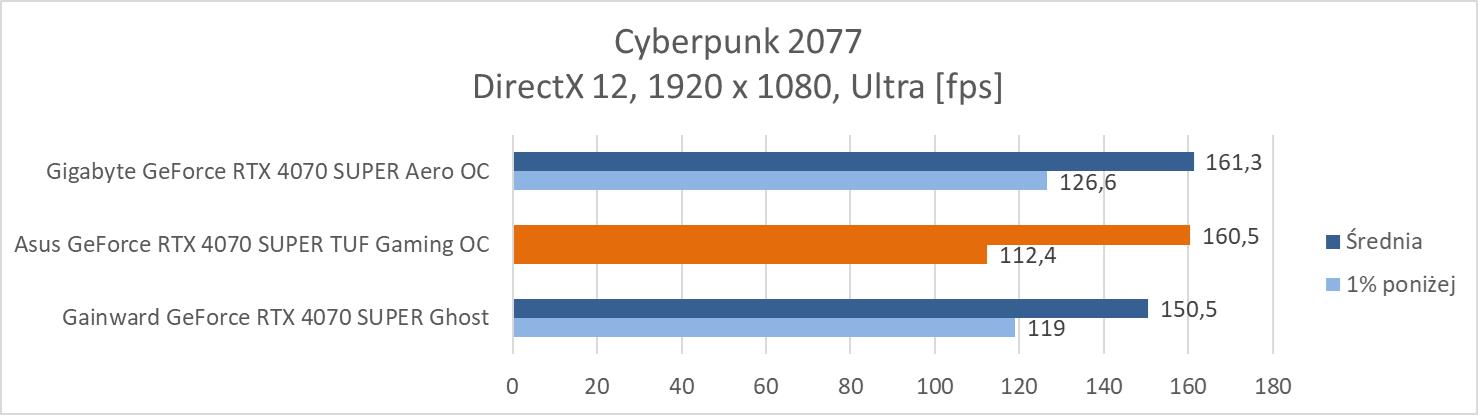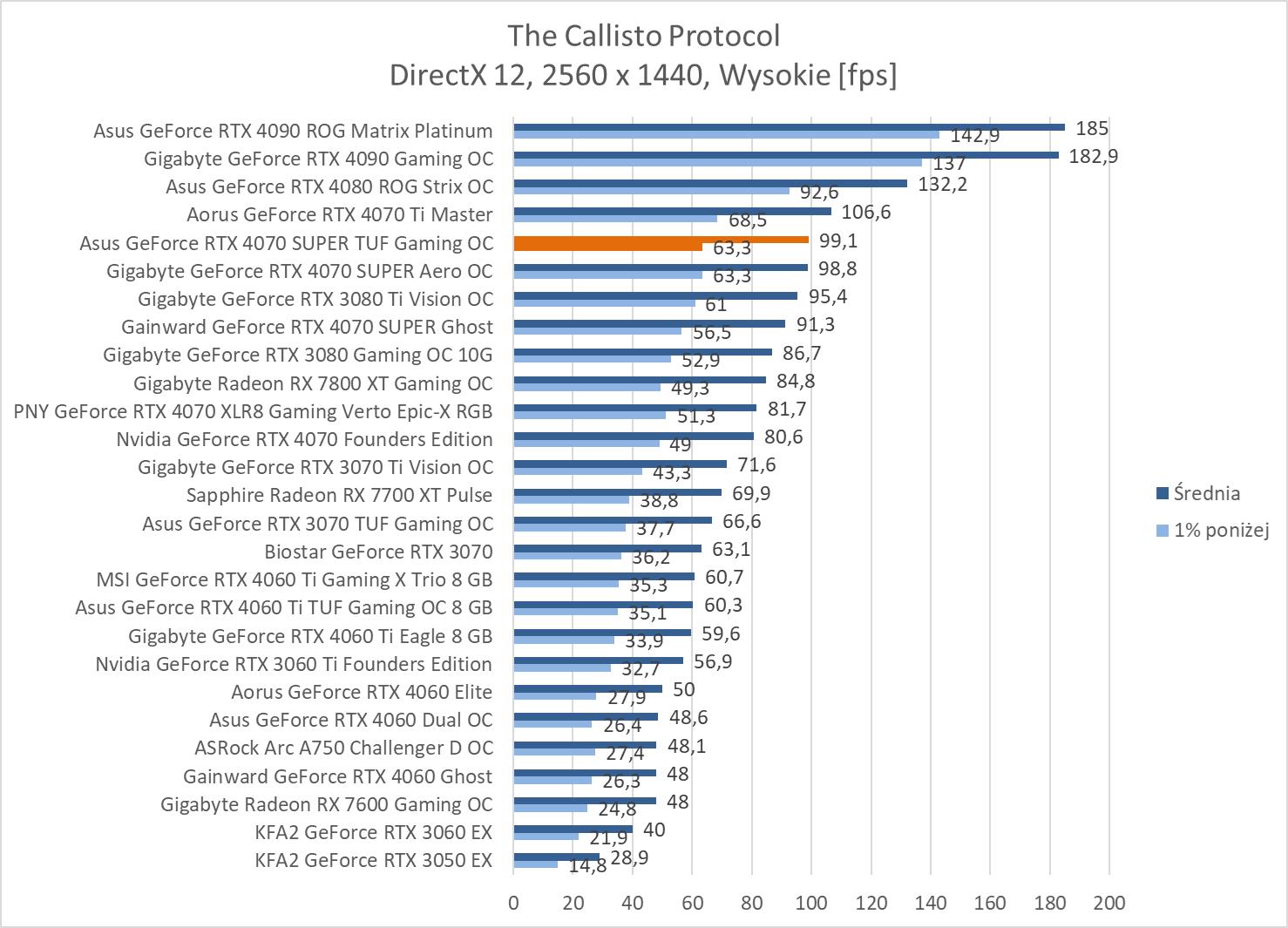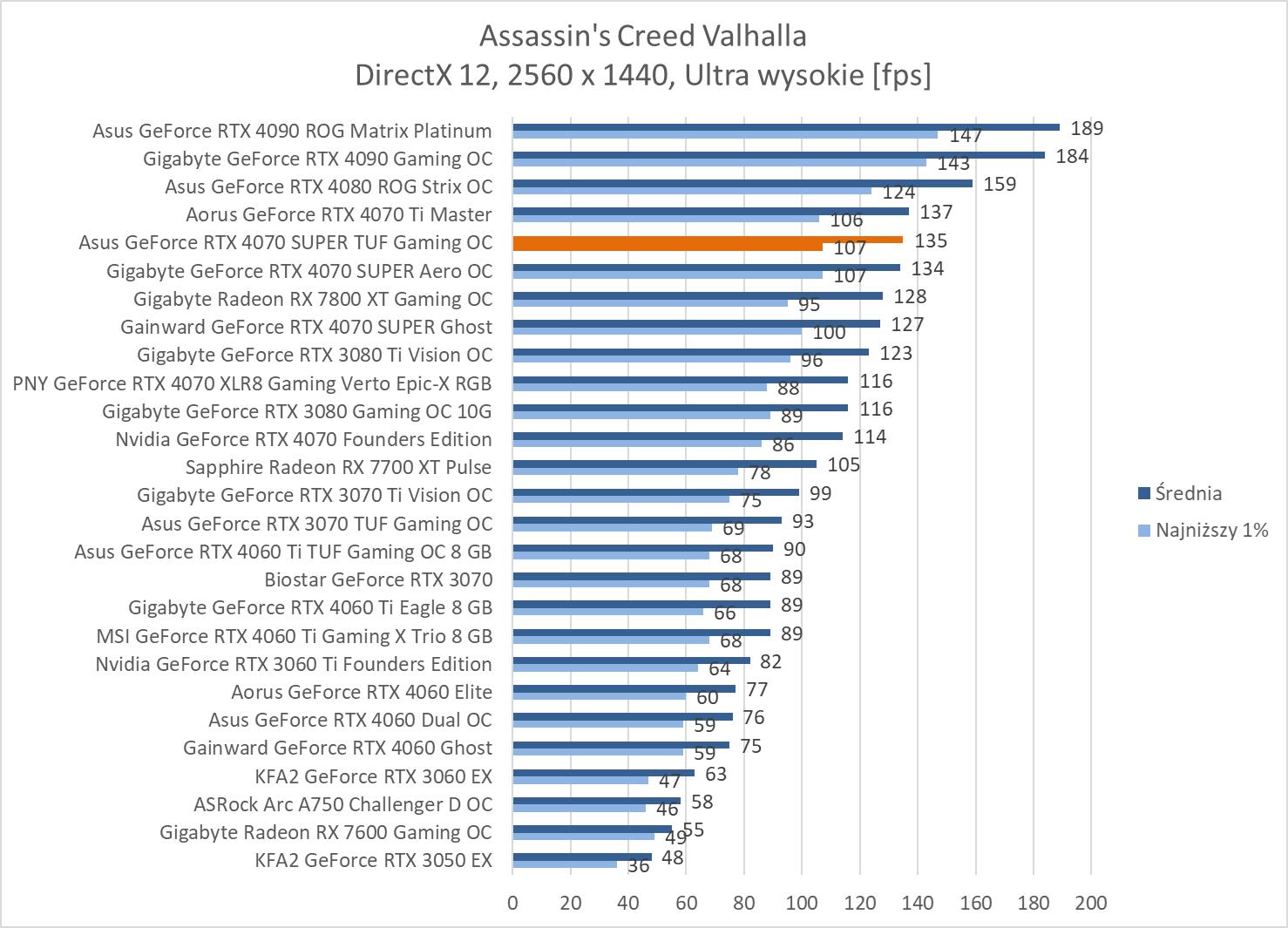 W 2560 x 1440 wszystko zależy od gry. Karta Asus GeForce RTX 4070 SUPER TUF Gaming OC zapewnia ponad 60 fps w mniej wymagających grach, ale w Hogwarts Legacy czy Cyberpunk 2077 wyniki są już niższe.
