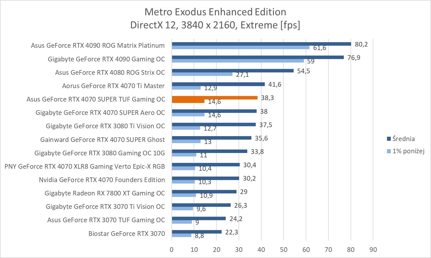 W grach z ray tracingiem ponownie mamy do czynienia z bardzo dobrymi wynikami. Przewaga nad RTX 4070 Founders Edition wynosi kolejno ok. 24,4%, 24,9% i 24,2%. Karta wypada też wyraźnie wydajniej niż niepodkręcony model RTX 4070 SUPER. Mamy też małą przewagę nad modelem Gigabyte RTX 4070 SUPER, ale tu różnice są naprawdę niskie. Z drugiej strony RTX 4070 Ti Master ma przewagę kolejno ok. 4,9%, 6,1% i 7,8%. Ponownie więc karcie bliżej jest do mocniejszego modelu.