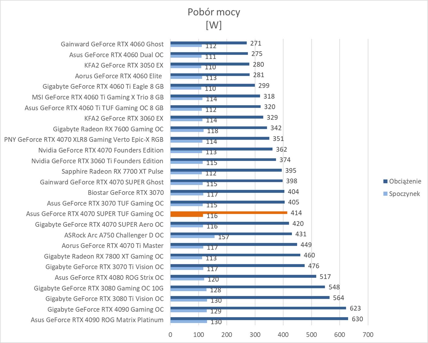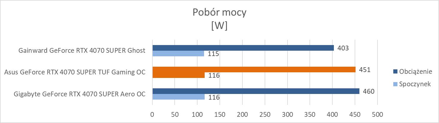 Pobór mocy jest wyższy niż w przypadku niepodkręconego modelu RTX 4070 SUPER. Natomiast jest on nadal tylko trochę wyższy od RTX 3070, a biorąc pod uwagę wzrost wydajności jest naprawdę dobrze.