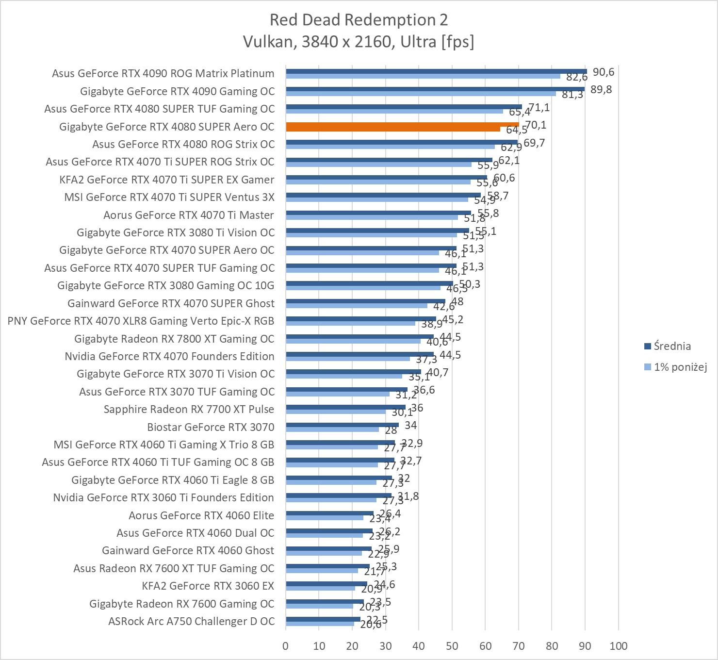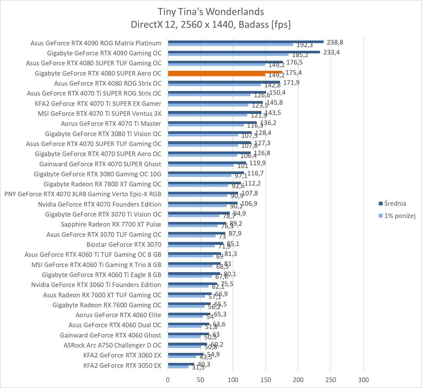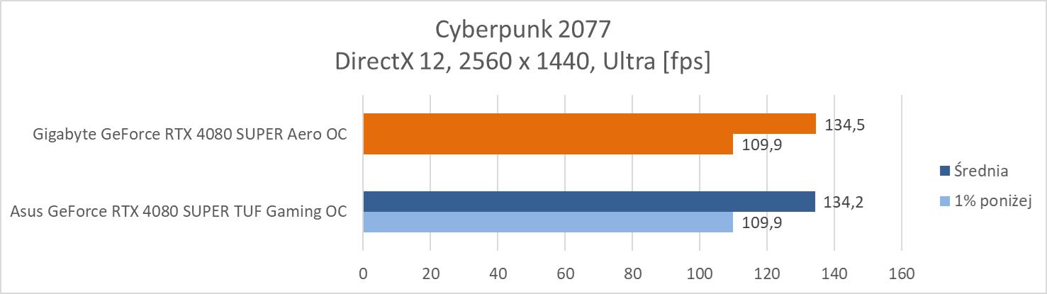Pod względem wydajności nie ma rewolucji. W rasteryzacji wyniki są tylko trochę wyższe niż w przypadku podkręconego RTX 4080 ROG Strix OC. Wyższe różnice są w przypadku ray tarcingu, ale nadal spodziewaliśmy się trochę większego wzrostu wydajności. Sama karta w rasteryzacji sprawdzi się w 3840 x 2160, choć mogą pojawić się gry z wynikami minimalnie niższymi niż średnio 60 fps. Przy ray tracingu przyda się DLSS 3, który jest kolejnym plusem tej serii kart. Z minusów musimy jeszcze wymienić brak DisplayPort 2.1. Zasilanie odbywa się ze złącza 12VHPWR, ale może to być lepszym rozwiązaniem niż 3x 8-pin. Szkoda też, że nie ma wzrostu w ilości pamięci VRAM względem RTX 4080.