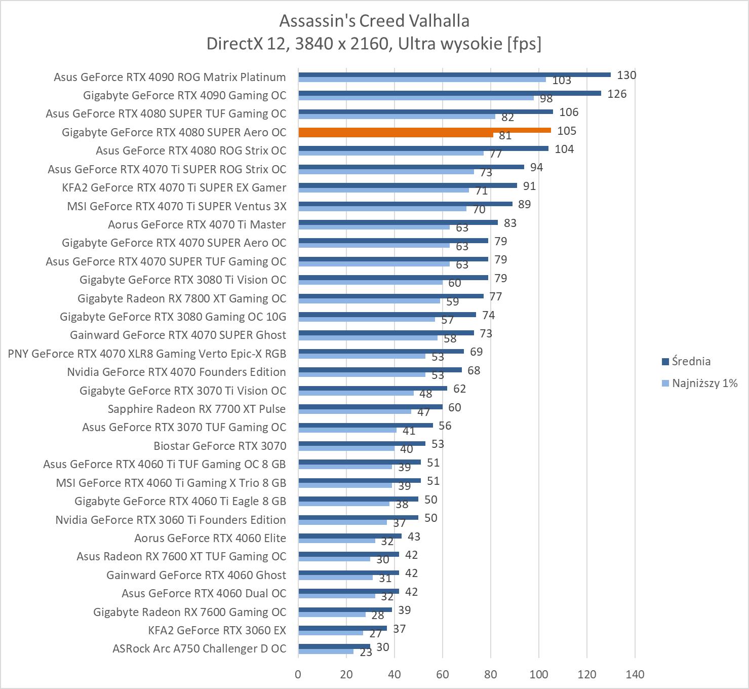 Gigabyte GeForce RTX 4080 SUPER Aero OC w testach wypada minimalnie słabiej od TUF Gaming OC, co było spodziewane. Różnice nie są jednak duże. Najciekawsze jest jednak porównanie do RTX 4080 w podkręconej wersji ROG Strix OC. Tutaj model Gigabyte ma przewagę kolejno 2,1%, 2,1% i 1,5%. Są to niskie różnice, ale na pewno występują. Liczyliśmy na trochę więcej od modelu SUPER tym bardziej, że strata do RTX 4090 pozostaje spora.