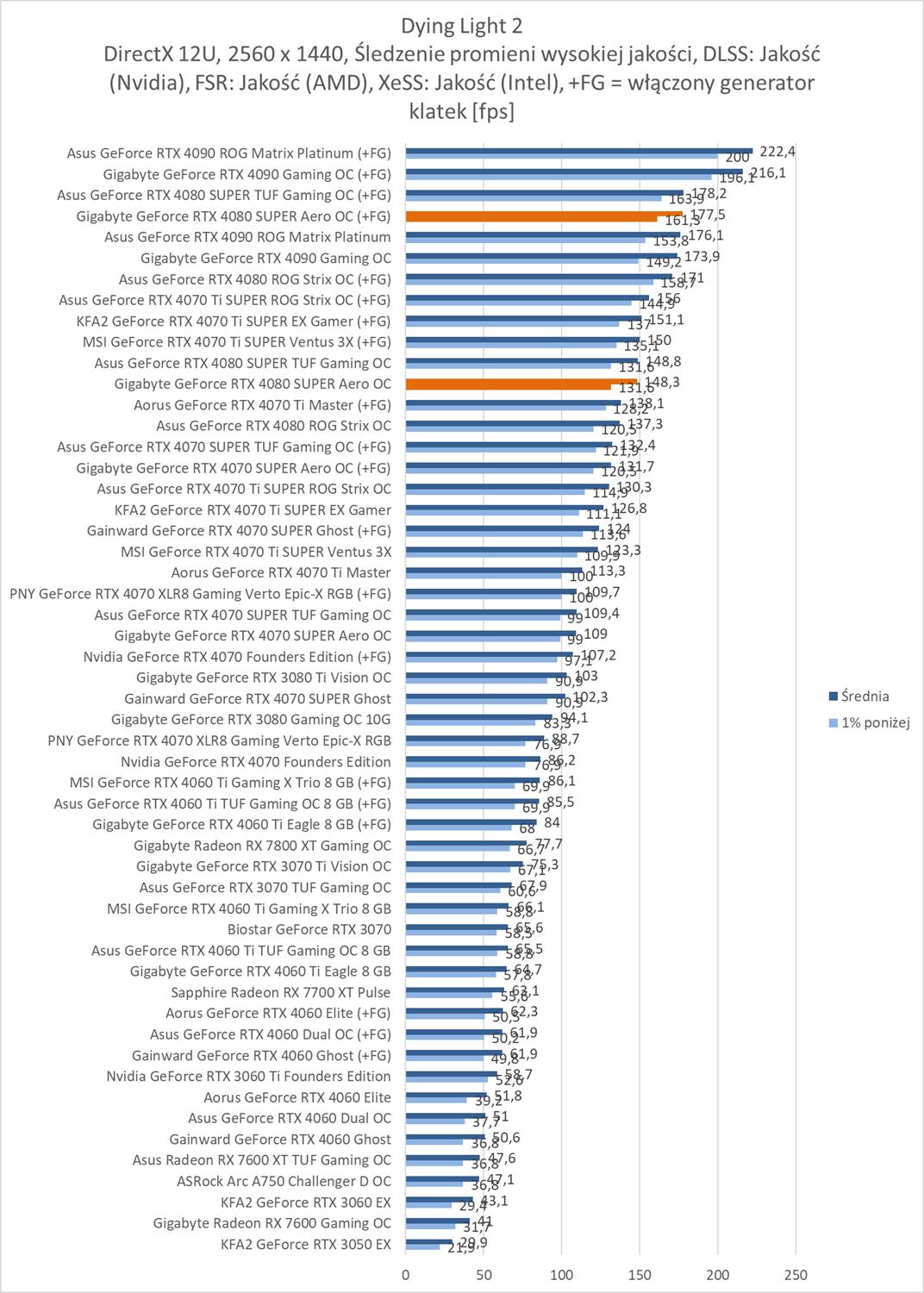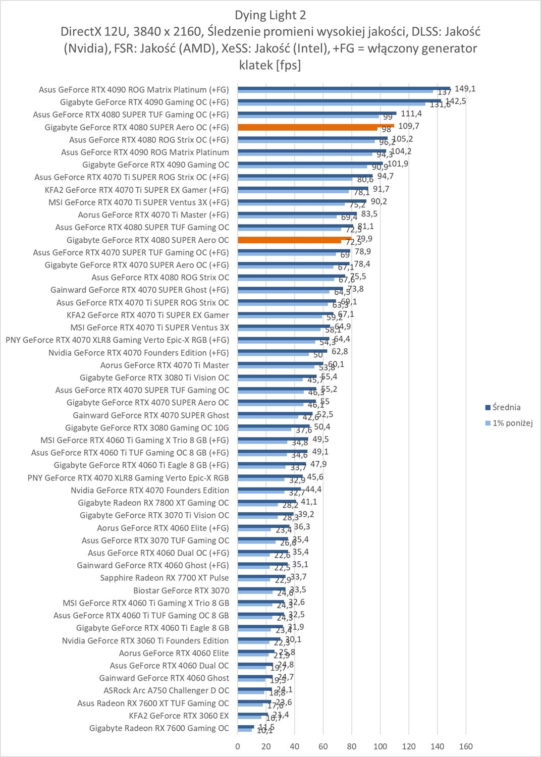 Zgodnie z oczekiwaniami w mniej wymagającej grze takiej jak Dying Light 2 wystarczy sam DLSS: Jakość do średnio 60 fps. W bardziej wymagającej jak Cyberpunk 2077 przyda się już generator klatek, choć bez niego wyniki też są całkiem niezłe.