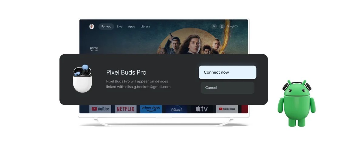 Znalazło się też coś dla właścicieli urządzeń z Google TV. W następnym miesiącu usługa Fast Pair zostanie najpierw udostępniona na Chromecasta z Google TV, a do końca roku także większej liczbie urządzeń z tym systemem. Dzięki temu, po przełączeniu akcesorium w tryb parowania wystarczy jedno dotknięcie, by podłączyć kompatybilny głośnik lub słuchawki do Google TV. Dostępna będzie także prosta kontrola wyjścia audio, dzięki której w dowolnym momencie szybko przełączysz się z powrotem na domyślny dźwięk telewizora.