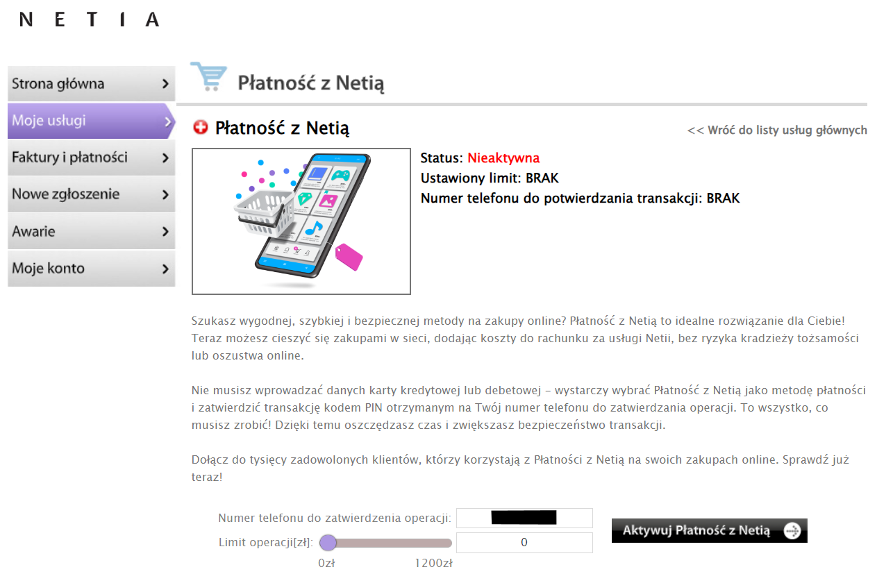 Usługę “Płatność z Netią” można aktywować w serwisie Netia Online lub telefonicznie. Co ciekawe, da się w niej ustawić limity płatności (do 1200 zł), aby ustrzec się przed nadmiernymi wydatkami, które niepostrzeżenie będziemy dodawać do rachunku. Autoryzacja płatności odbywa się z udziałem kodów autoryzacyjnych przesyłanych w formie wiadomości SMS na numer telefonu użytkownika wskazany w procesie aktywacji. Można podać dowolny numer, na które takie kody będą przychodzić (może on należeć do dowolnego operatora komórkowego). Dobra wiadomość jest taka, że działa tu również mechanizm odroczonej płatności, tak jak ma to miejsce w przypadku standardowych usług Netii.