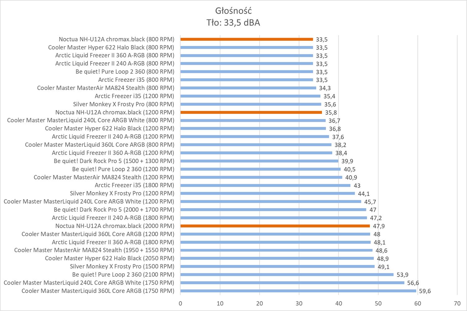 Na maksymalnych obrotach chłodzenie będzie głośne, ale jak na 2000 RPM nie jest źle. Tutaj inne konstrukcje potrafią wypadać trochę gorzej, a wysokie obroty muszą się wiązać z większą głośnością. Ale przy 1200 RPM jest już świetnie i Noctua NH-U12A chromax.black jest naprawdę cicha, a przy 800 RPM na pewno jej nie usłyszycie. Generalnie więc pod tym względem cooler wypada naprawdę dobrze.