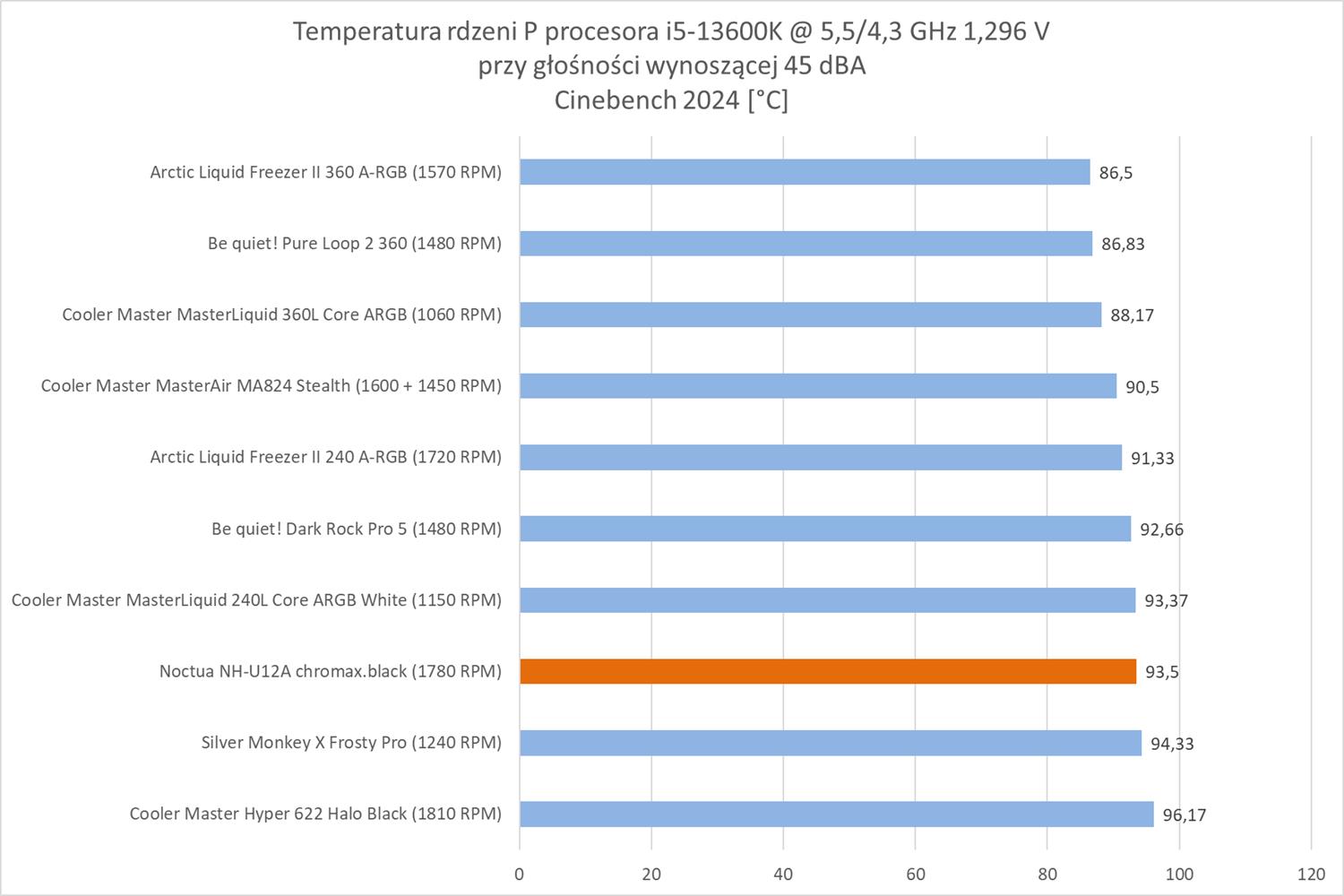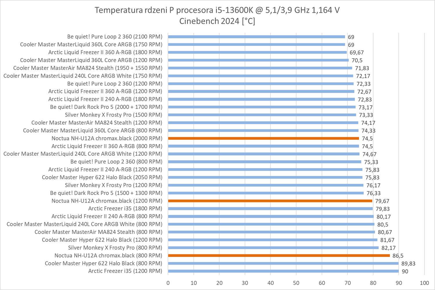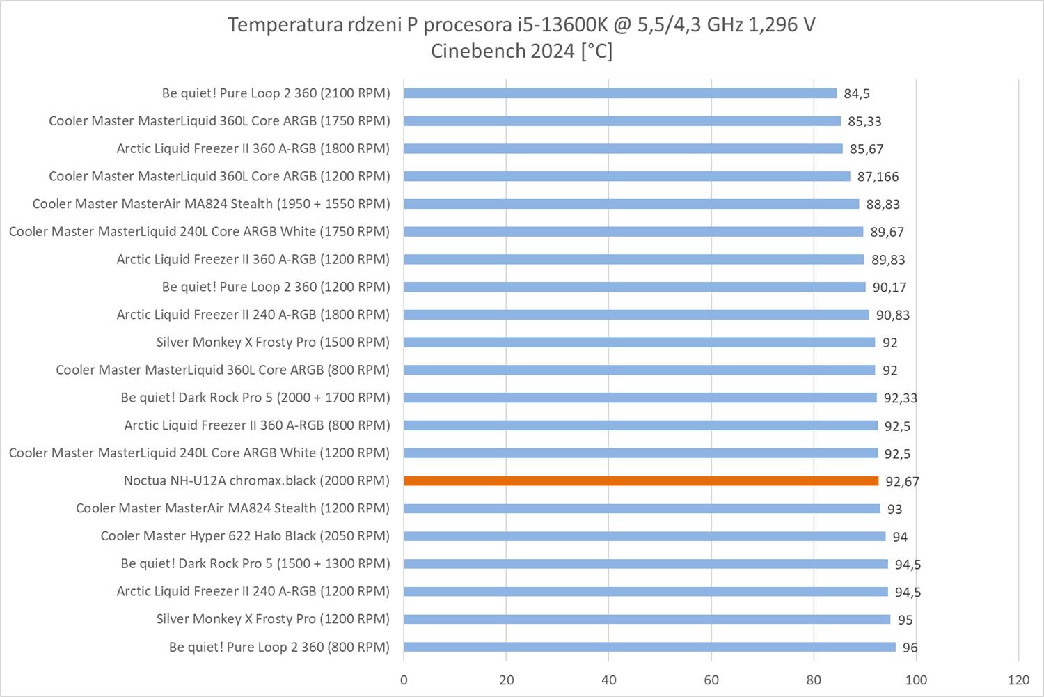 Po OC Noctua NH-U12A chromax.black ponownie przegrywa z wydajniejszymi chłodzeniami, ale pokonuje 622 Halo Black czy Dark Rock Pro 5 w trybie Q. Jest też dosyć blisko Dark Rock Pro 5 w trybie P czy X Frosty Pro, więc wydajność jak na takie rozmiary po OC jest naprawdę dobra. Tutaj jednak przy 1200 RPM chłodzenie nie dało rady i procesor dobijał do 100°C na niektórych rdzeniach.