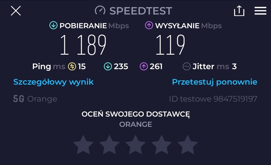 Ostatni raz wyniki przekraczające 600 Mb/s widziałem w 2019 i 2020 roku, kiedy miałem okazję przetestować sieć 5G na zupełnie pustych nadajnikach. Tymczasem dzisiaj po godzinie 19 test prędkości Internetu 5G sieci Orange pokazał mi prawie 800 Mb/s, a test zrobiony przed momentem wygląda tak: