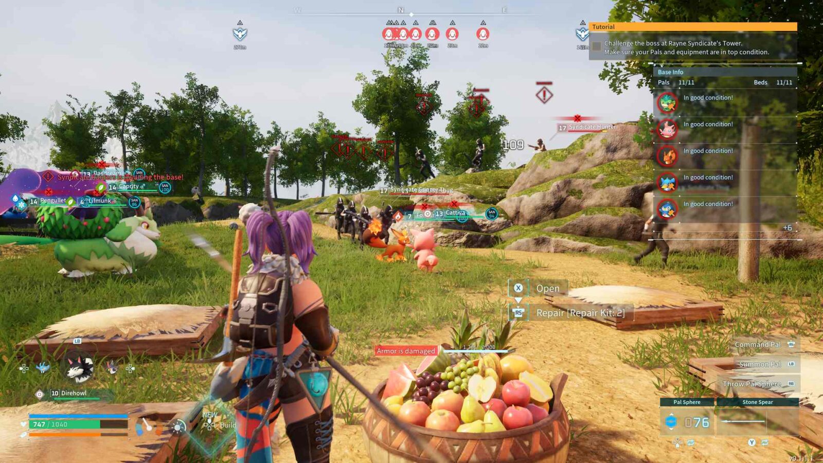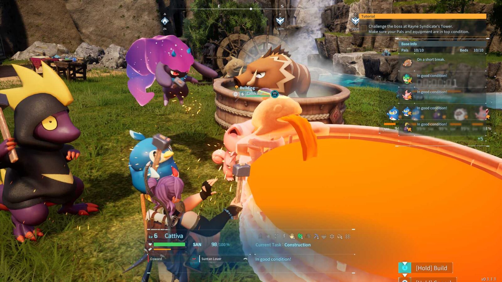Na wczesnym etapie towarzyszą nam zadania, które są częścią tutorialu. I jak zawsze w tego typu grach, początki są skromne. Nasze zadania są następujące – walcz ze stworkami po to, by je osłabić, a gdy tak się stanie, rzuć w nie kulistym przedmiotem i złap je do magazynu. Do tego momentu gra wydaje się całkiem podobna do innej japońskiej produkcji, ale potem przychodzą momenty, w których Palworld zyskuje pewną tożsamość.