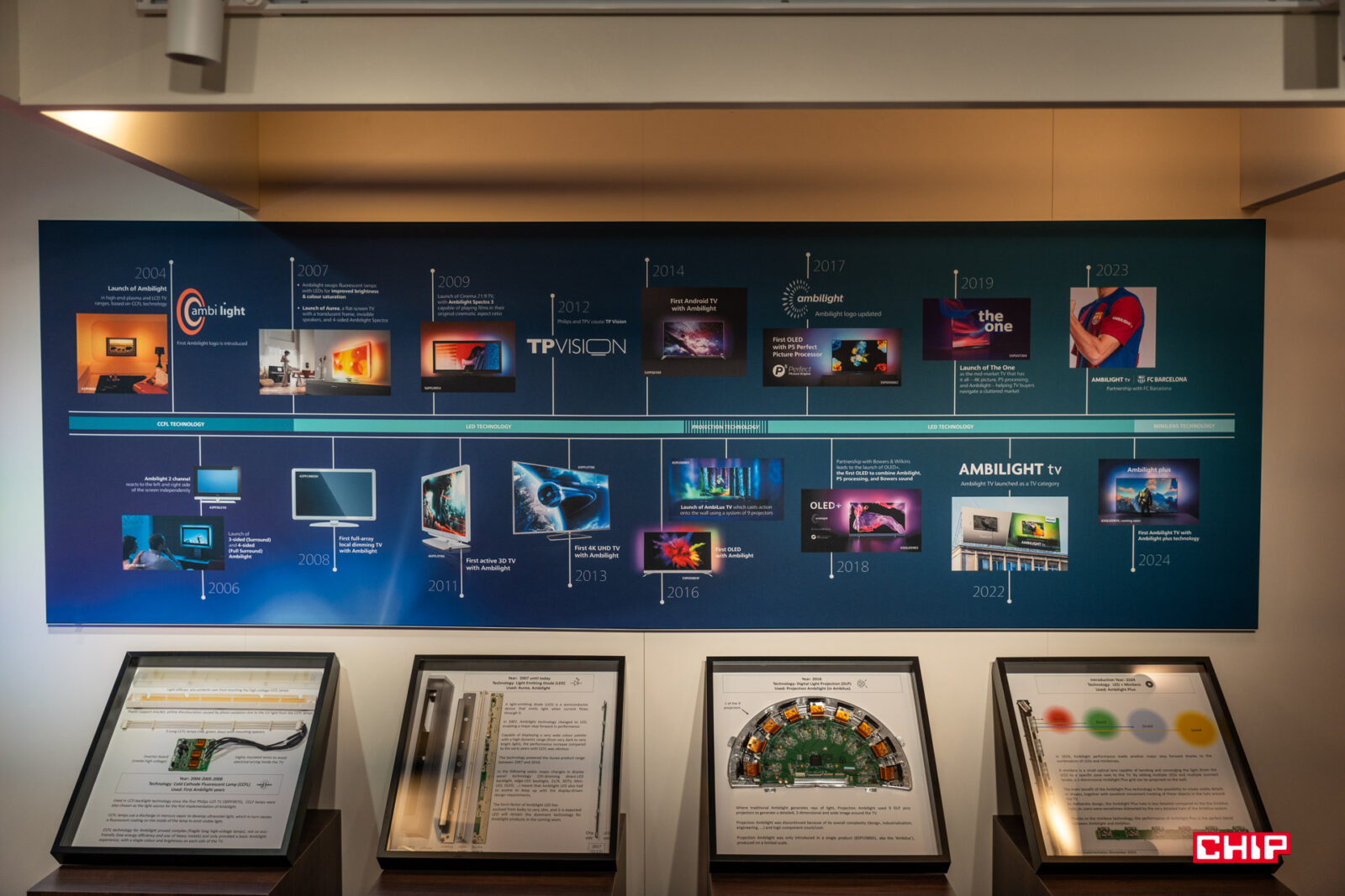 Zacznijmy od najbardziej imponującej nowości, jaką jest tegoroczny flagowy telewizor OLED+ 959. Jego najbardziej efektowną nowością jest podświetlenie Ambilight+ i jest zwieńczeniem 20-letniej historii tej technologii. Niewiele osób może to pamiętać, ale 20 lat temu Ambilight wyglądał tak: