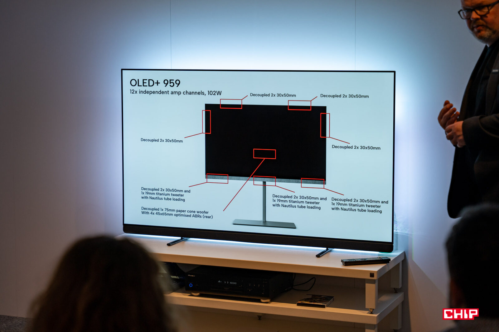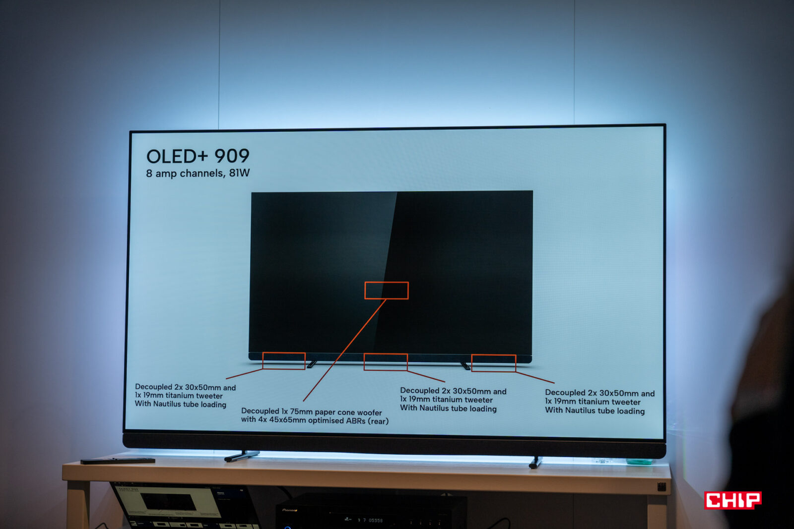 O wiele bardziej dostępnym i przystępnym modelem będzie tegoroczny flagowiec – OLED+ 909. Dostępny z ekranami o przekątnej 55, 65 i 77 cala, wyposażony w nowy procesorem 8th Gen P5 AI oraz panel OLED Meta 2.0, a także oferujący 144 Hz odświeżanie obrazu. Znajdziemy tu 4-stronne podświetlenie Ambilight i nowe głośniki Bowers&Wilkins w systemie 3.1, o mocy 81 W. Są to głośniki o nowym kształcie, ma mieć przełożenie na lepszą jakość dźwięku.