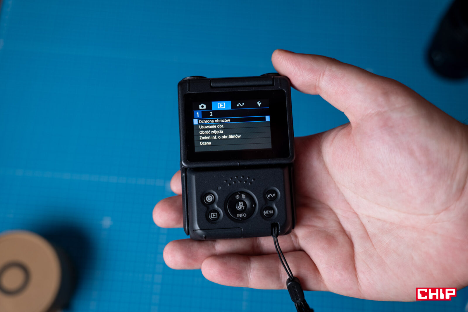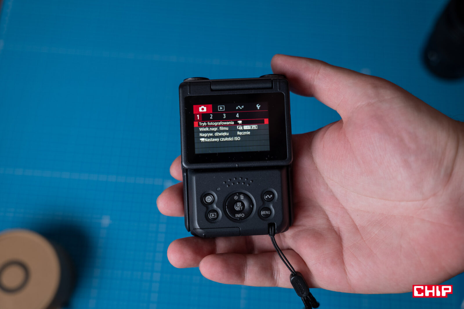 Po wyjęciu kamery z pudełka oczom ukaże się wam sprzęt przypominający na pierwszy rzut oka dyktafon. Górna część prezentuje w końcu dwa odstające mikrofony, a na froncie gości spory przycisk nagrywania. Gdy jednak obrócimy sprzęt o 180 stopni, to dostrzeżemy jego vlogową naturę. Naszym oczom ukaże się wtedy dotykowy, ale przede wszystkim odchylany, ekran, a pod nim rząd przycisków. Między tymi dwoma częściami znajduje się regulowana podpora, której nie przesuniemy bez podniesienia ekranu. Mała rzecz, ale ma uzasadnienie z perspektywy ustawiania ekranu frontem do nas. Ponadto PowerShot V10 przykręcimy do statywu – na dole znalazł się gwint ¼ cala. Szkoda, że producent nie postarał się o uszczelnienie tej konstrukcji – otworzyłoby to wiele możliwości.