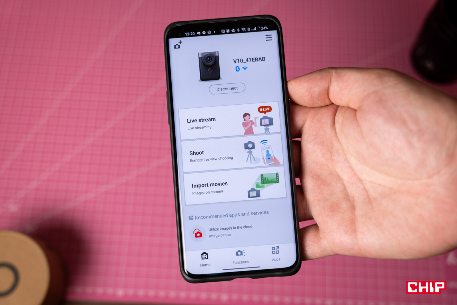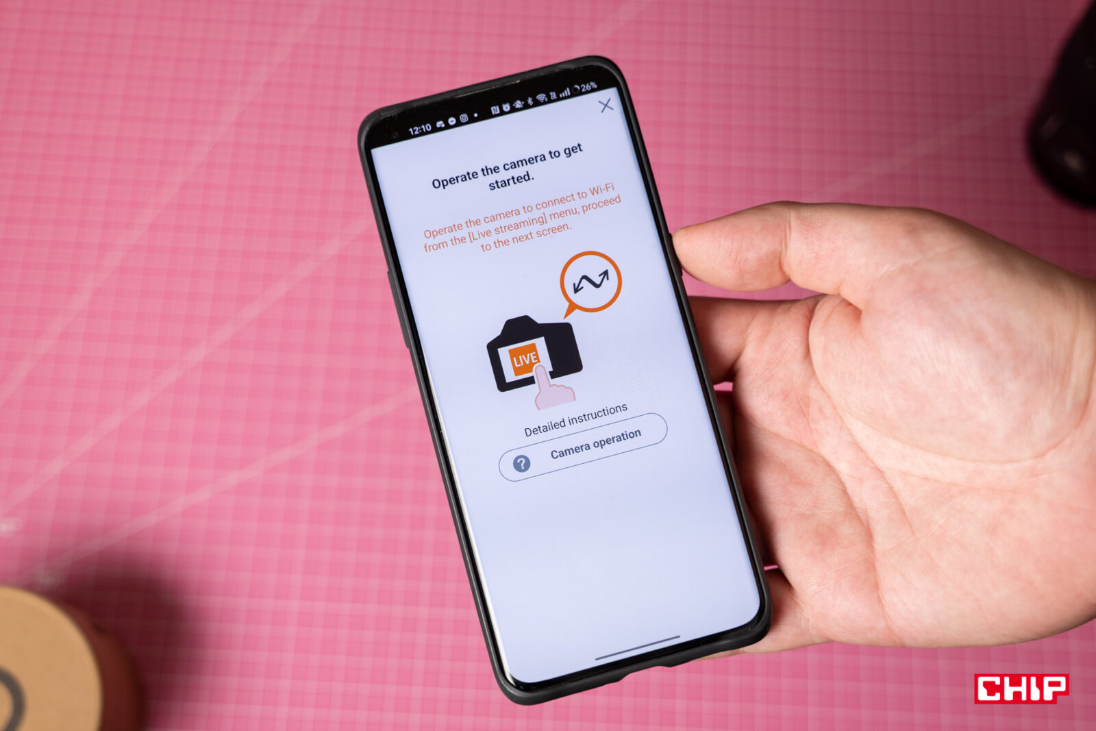 Canon PowerShot V10 reklamuje się nie tylko możliwościami vlogowymi, ale chociażby funkcjami związanymi z transmisją na żywo. Aby z nich skorzystać, potrzebujemy połączyć urządzenie z aplikacją Canon Camera Connect, dostępną na Androidzie oraz iOS (ja testowałem tę pierwszą wersję).