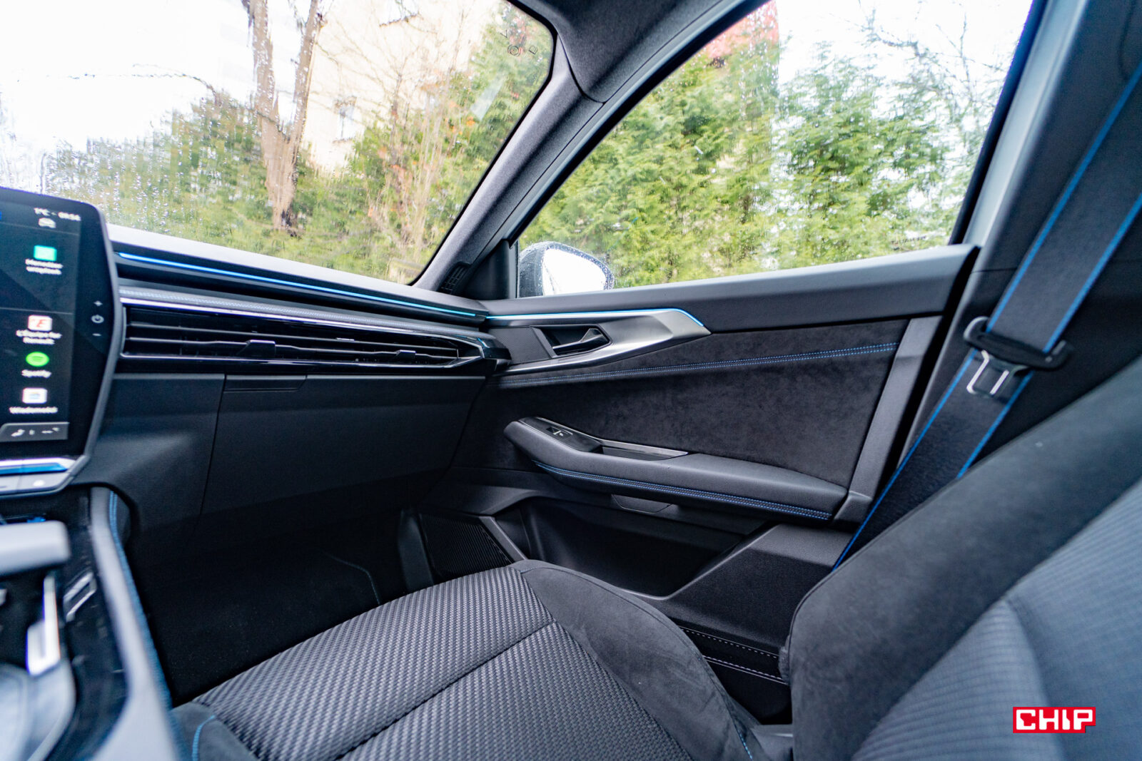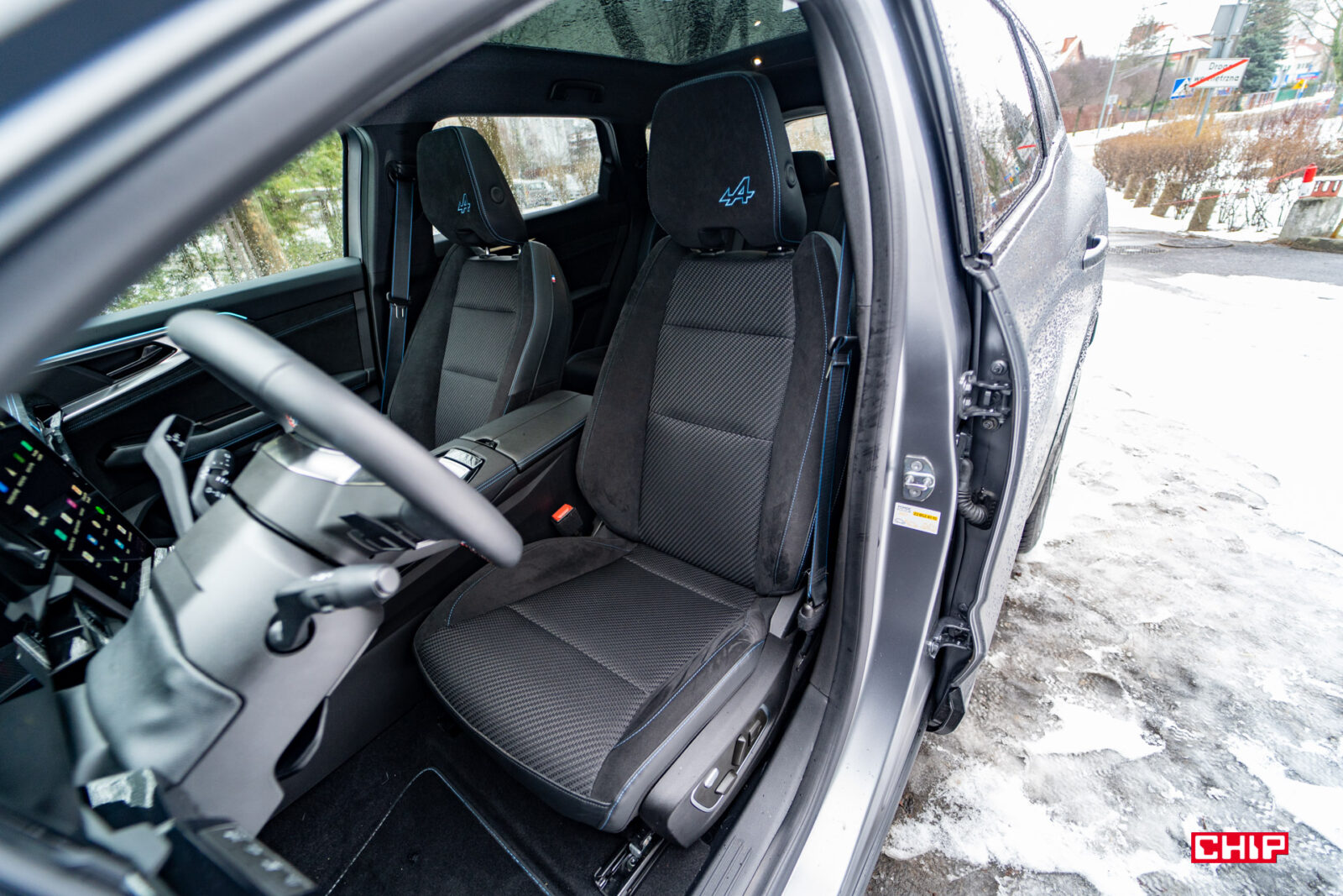 Ten grill o modnym ostatnio wzorze szachownicy, piękny matowy lakier, 20-calowe felgi o ciekawej stylistyce, do tego napakowana, mięsista maska i lampy wyraźnie nawiązujące do francuskiego rodzeństwa Espace – trudno nie docenić urody tego auta. Nawet ja, niezbyt oddana fanka segmentu, uśmiechałam się na jego widok. Jasne, wersje techno i iconic prezentują się bardzo dobrze, ale to testowana wersja esprit Alpine robi wrażenie. Polecam obejrzenie jej na żywo, sami się przekonacie.