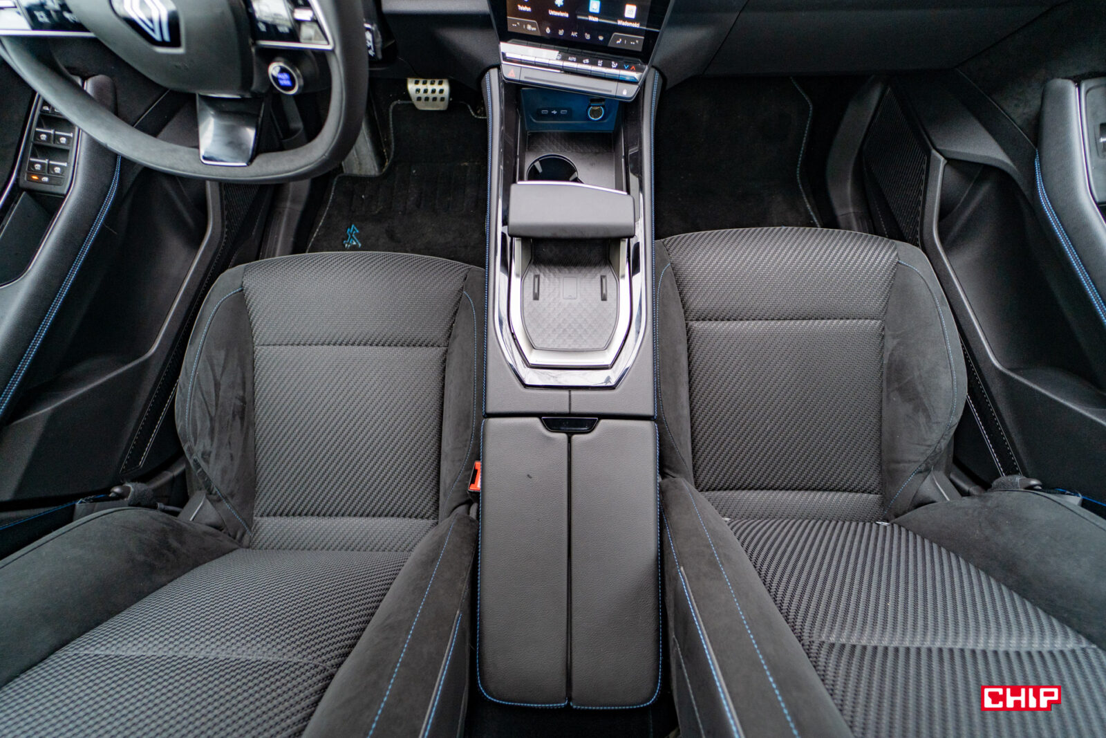 W środku nowego Espace mamy…cóż, mamy salon. Auto było kiedyś 7-miescowym VAN-em, następnie znacznie się rozrosło i stało się SUV-em, więc o ciasnocie nie może być mowy. Z przodu mamy dwa mięciutkie fotele, szeroki podłokietnik, ładowarkę indukcyjną, masę schowków i prawie 25 cali ekranów (!), do tego wysokość od siedziska do dachu wynosi 958 mm (wersje bez panoramicznego dachu – 923 mm), szerokość kabiny na wysokości barków na przednich miejscach to 1445 mm, natomiast szerokość nad przednimi podłokietnikami – 1497 mm.