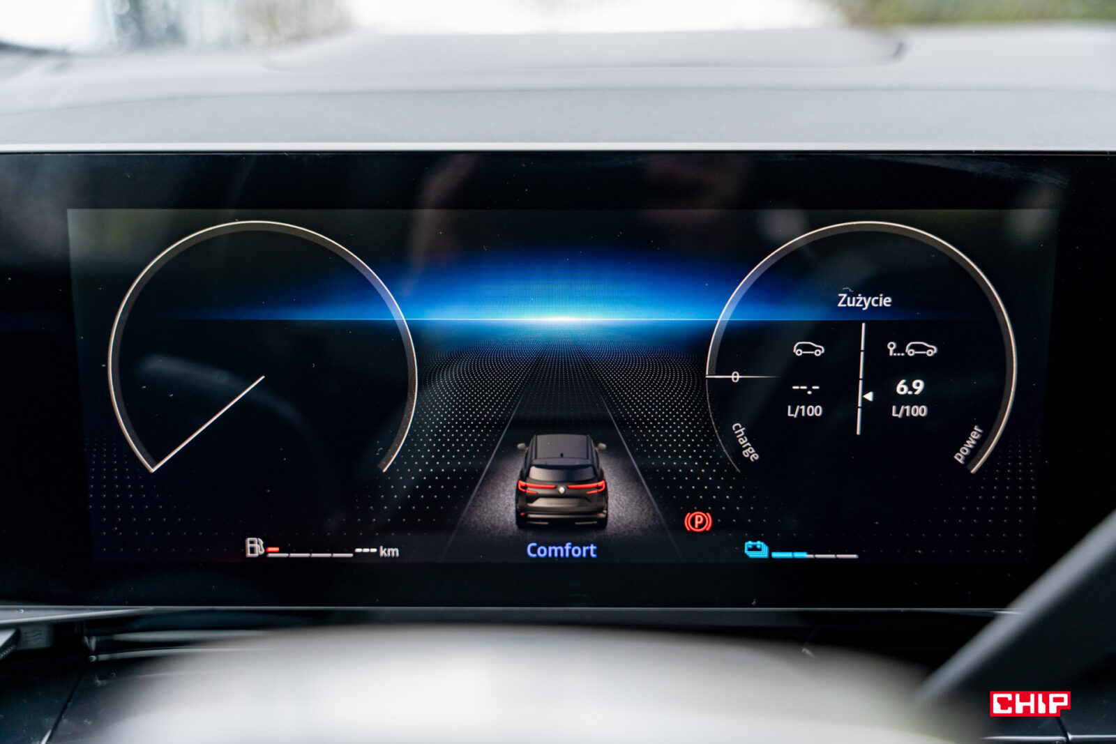 Ciekawie przemyślanym elementem jest umieszczenie podświetlenia wnętrza na wysokości ekranu kierowcy. Na nim wyświetlany jest wirtualny horyzont w postaci poziomej linii i jeśli mamy kolor podświetlenia spięty z aktualnym trybem jazdy, linia na ekranie i podświetlenie tworzą bardzo efektowną, spójną całość. Bajer, ale jaki ładny!