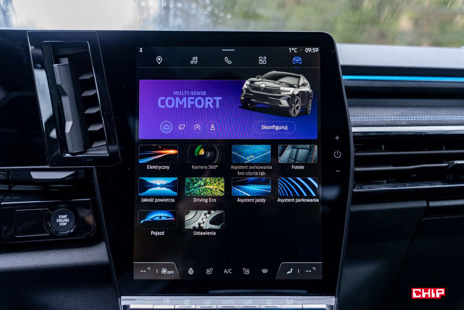 Nowy Espace, może niekoniecznie tak jak Clio, też potrafi zaparować, ale tylko w jednym konkretnym scenariuszu. Na wyposażeniu mamy system oczyszczania powietrza i jednym dotknięciem ekranu możemy uruchomić filtrację. No i tak, dzięki temu szybko pozędziemy się nieprzyjemnych zapachów, ale wydmuchiwane powietrze jest dosyć chłodne i zimą, kiedy na ogół we wnętrzu auta mamy ustawione ponad 20 stopni w ciągu dosłownie minuty szyby robią się zaparowane. W cieplejsze okresy nie powinno to stanowić problemu, ale zimą musimy pamiętać, żeby szybko wyłaczać system oczyszczania powietrza.