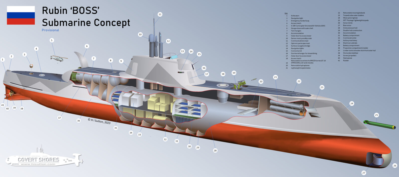 Rosyjska firma obronna Rubin Design Bureau, zaproponowała niekonwencjonalne rozwiązanie dla straży granicznej kraju, które przyjmuje formę uzbrojonego okrętu podwodnego, zaprojektowanego specjalnie do patrolowania ogromnych morskich granic Rosji. Okręt nazwany mianem Border and Offshore Submersible Sentry (BOSS) stanowi radykalne odejście od tradycyjnych koncepcji zarówno okrętów podwodnych, jak i sprzętów przeznaczonych do patrolu granicznego, a ze swoją 1300-tonową wypornością jest bardzo mały względem typowych okrętów podwodnych.