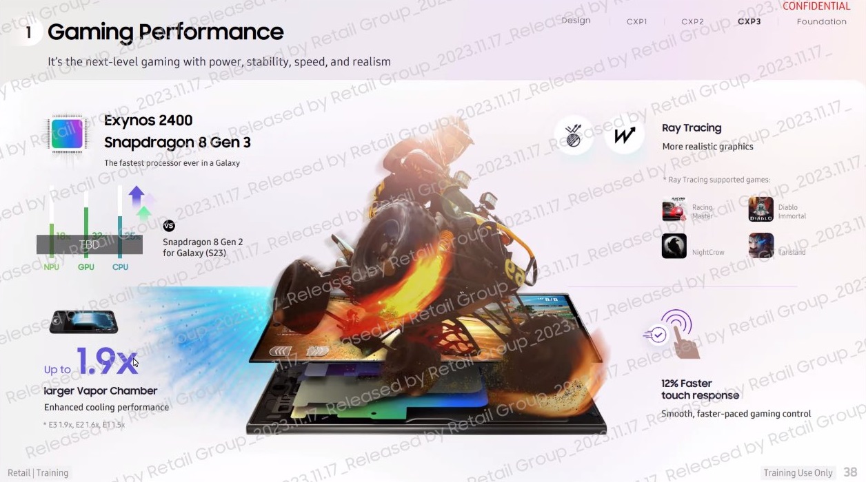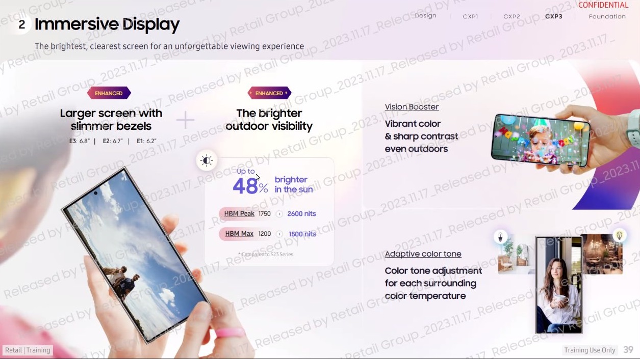 - Screen Display – zgodnie z oczekiwaniami, ekrany w nadchodzących Galaxy S24 i Galaxy S24 Plus ulegną poprawie, dzięki czemu będą jaśniejsze, a szczegóły lepiej widoczne, nawet przy najjaśniejszym świetle. Samsung wprowadzi też funkcję Eye Comfort Shield, która pomoże zrelaksować oczy przed snem, dostosowując jego jasność tak, by zminimalizować zmęczenie wzroku. Będzie więc widoczna poprawa w porównaniu z poprzednią serią.