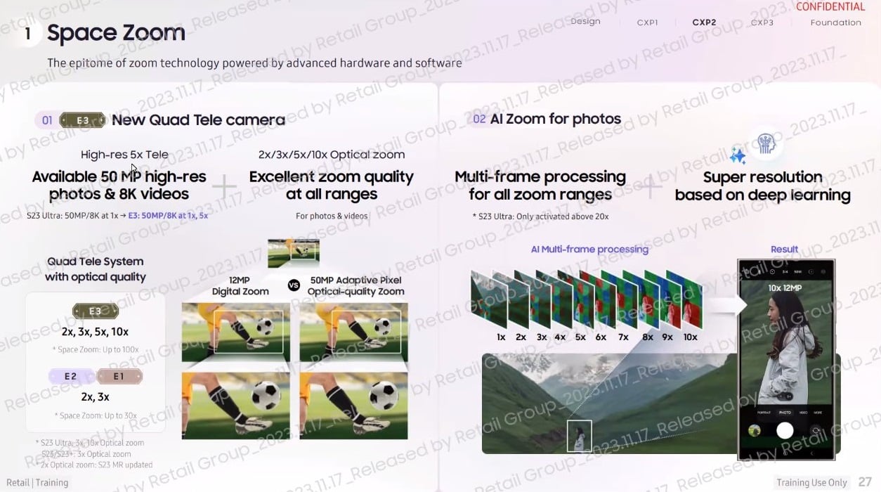 Teraz przyjrzyjmy się specyfikacji aparatów. Zgodnie z informacjami, główny aparat we wszystkich modelach ma oferować możliwość nagrywania w 8K w 30 klatkach na sekundę. Pojawią się też funkcje sztucznej inteligencji poprawiające jakość ujęć nocnych, o czym jednak za chwilę. Galaxy S24 i S24+ dostaną też 30-krotny zoom cyfrowy, a Ultra – 100-krotny. Oto, jakie aparaty znajdziemy na pokładzie serii: