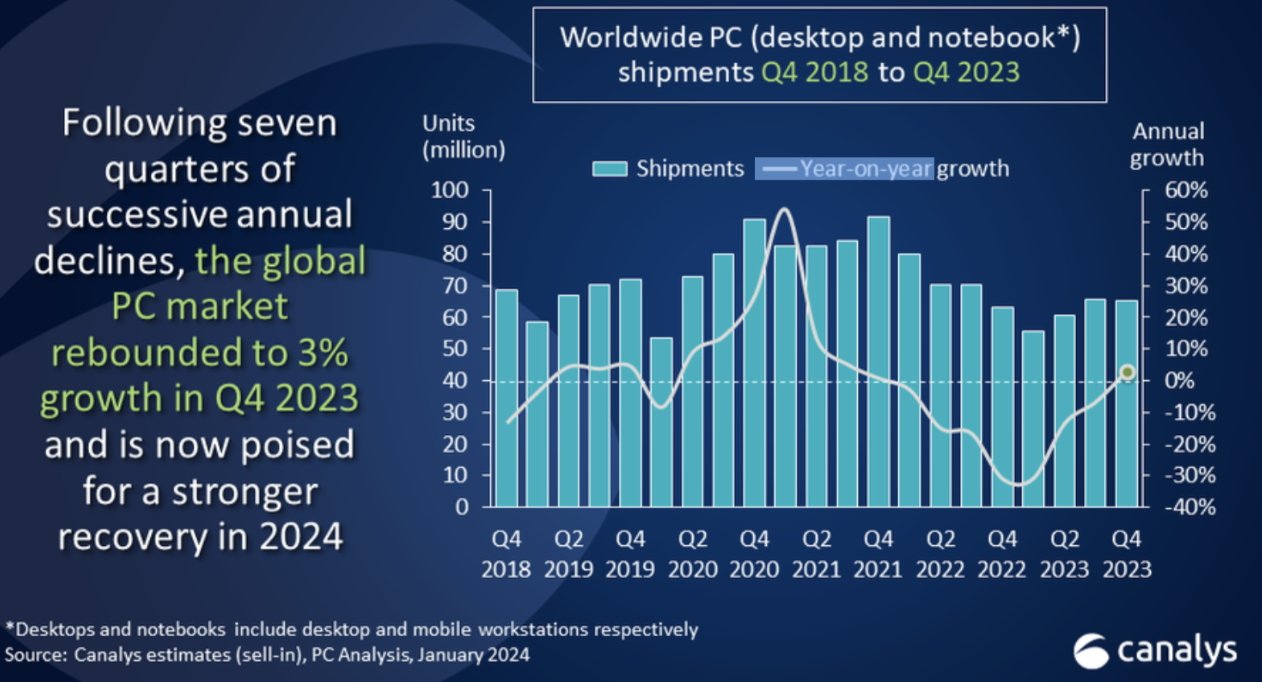 W opinii analityków Canalys, w ostatnim kwartale 2023 roku w branży producentów PC zakończyła się passa rocznych spadków dostaw, odnotowując skromny, ale jednak, wzrost o 3% rok do roku. Najlepiej poradziła sobie firma Lenovo, która tylko w czwartym kwartale dostarczyła na rynek 16,1 miliona komputerów PC (wzrost o 3% w ujęciu rocznym). W tym samym czasie drugą pozycję zajęła firma HP odnotowując wzrost swojej sprzedaży o 6% rok do roku, a na trzecim miejscu uplasowała się firma Dell (w Q4 2023 udało im się osiągnąć wynik sprzedaży na poziomie 9,9 miliona sztuk).