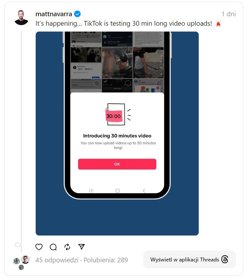 Tak krótki format wielu twórcom nie daje możliwości nagrywania tego, co zwykle robią na YouTubie, przez co jest to raczej platforma dodatkowa, a nie główne miejsce dla umieszczenia ich twórczości. To się jednak zmieni i to wkrótce, bo jak donosi ekspert ds. mediów społecznościowych Matt Navarra, w najnowszej wersji beta aplikacji odkrył nowy limit długości filmów, wynoszący aż 30 minut. Na poniższym zrzucie ekranu widzimy powiadomienie, które wyświetliło się podczas dodawania filmu. Podobne pojawiały się już wcześniej, za każdym razem, kiedy TikTok dokonywał tego typu zmian.
