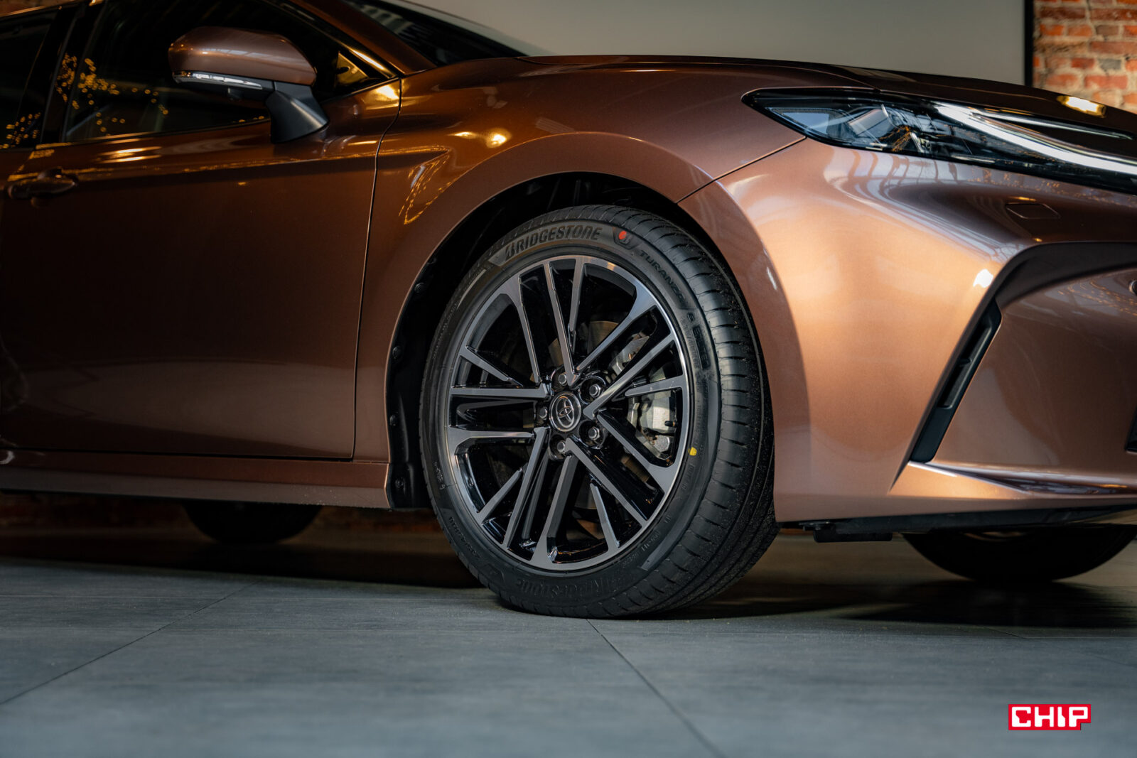 Camry przeszła też nieco zmian wizualnych. Szczególnie przód jest teraz bardzo agresywny. Kojarzycie duże grille w nowych Lexusach? W Camry mamy… jakby pół takiego grilla? Do tego charakterystyczny kształt litery X, jaki tworzy linia grilla i przetłoczeń na masce. W połączeniu z nowym kształtem przednich reflektorów, jak w nowym Priusie i CH-R to bardzo przyciąga wzrok. Auto ma też nowe 18-calowe felgi i jest dłuższe o 3,5 cm w stosunku do poprzednika (4,92m). A wszystko to znajduje się na płycie podłogowej przystosowanej do produkcji auta hybrydowego.