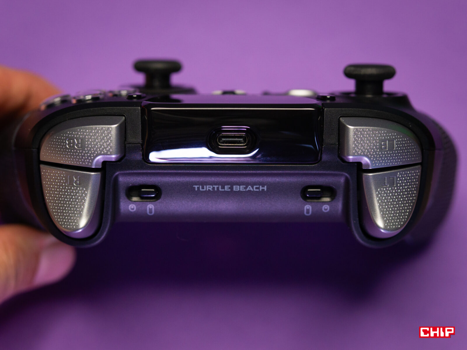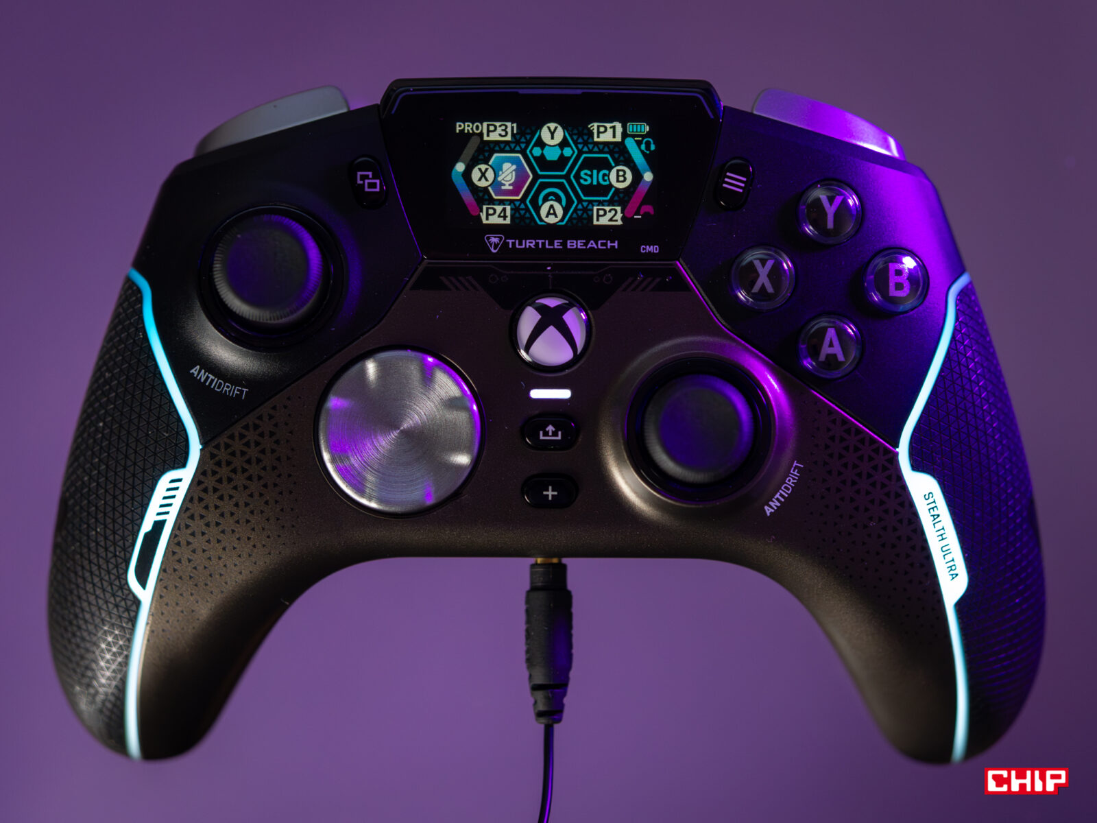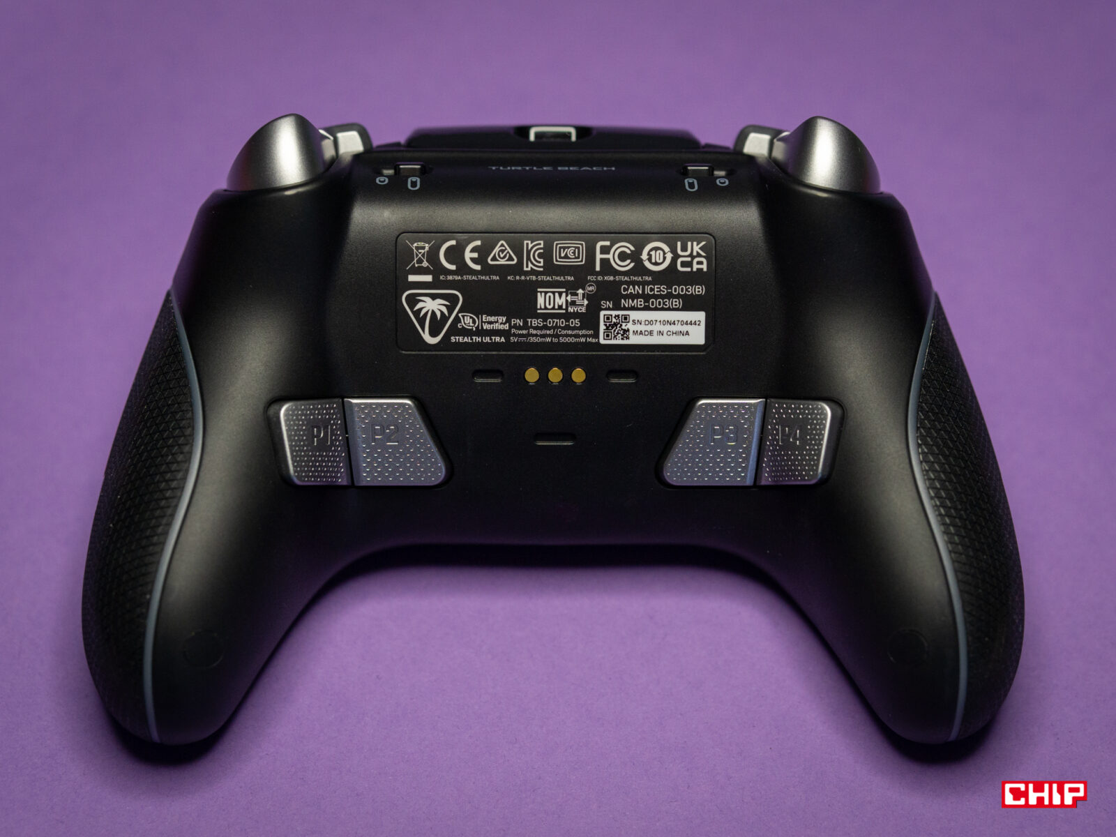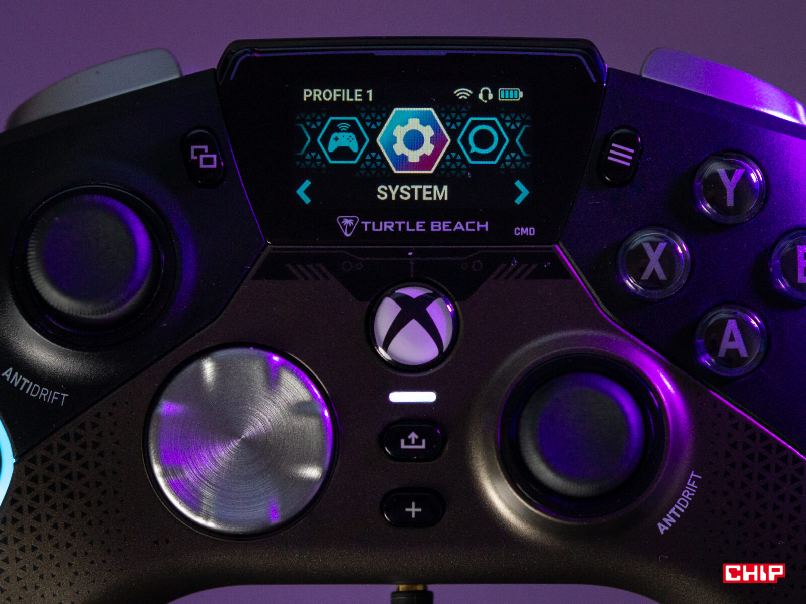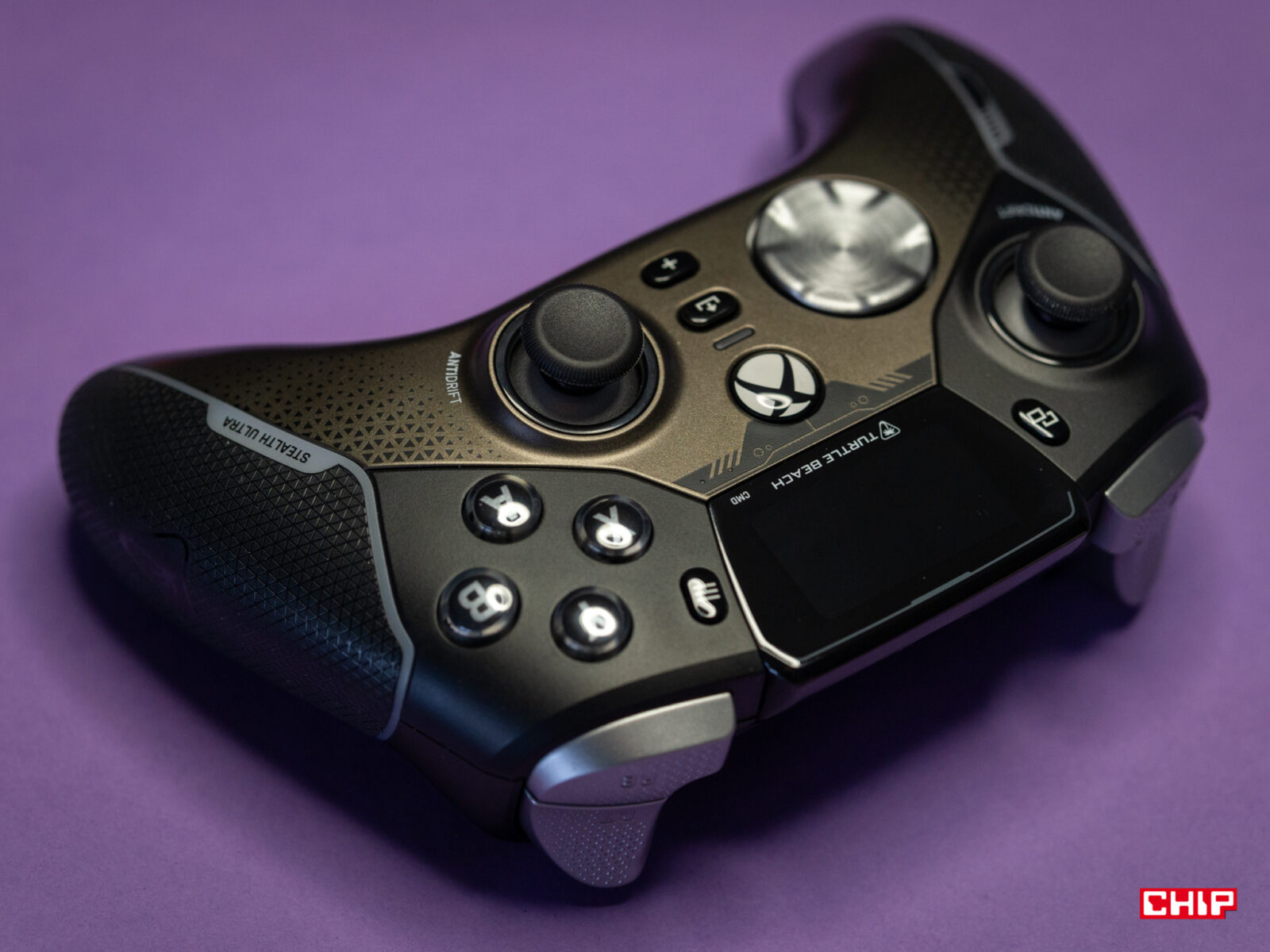 Próg wejścia dla potencjalnych nabywców Turtle Beach Stealth Ultra jest stosunkowo niski (pomijając oczywiście aspekt cenowy). Wyobraźcie sobie bowiem podstawowy kontroler do gier dla konsoli Xbox Series S/X. Największą różnicę stanowi wbudowany w Stealth Ultra kolorowy wyświetlacz, przez który główny włącznik z charakterystyczną ikoną powędrował do dołu, a towarzyszące mu przyciski rozjechały się w trzech kierunkach. Prawa i lewa strona w obu konstrukcjach z grubsza wygląda dość podobnie, ale kolejne niespodzianki czekają na nas po odwróceniu kontrolera Turtle Beach do góry nogami (do dołu drążkami).
