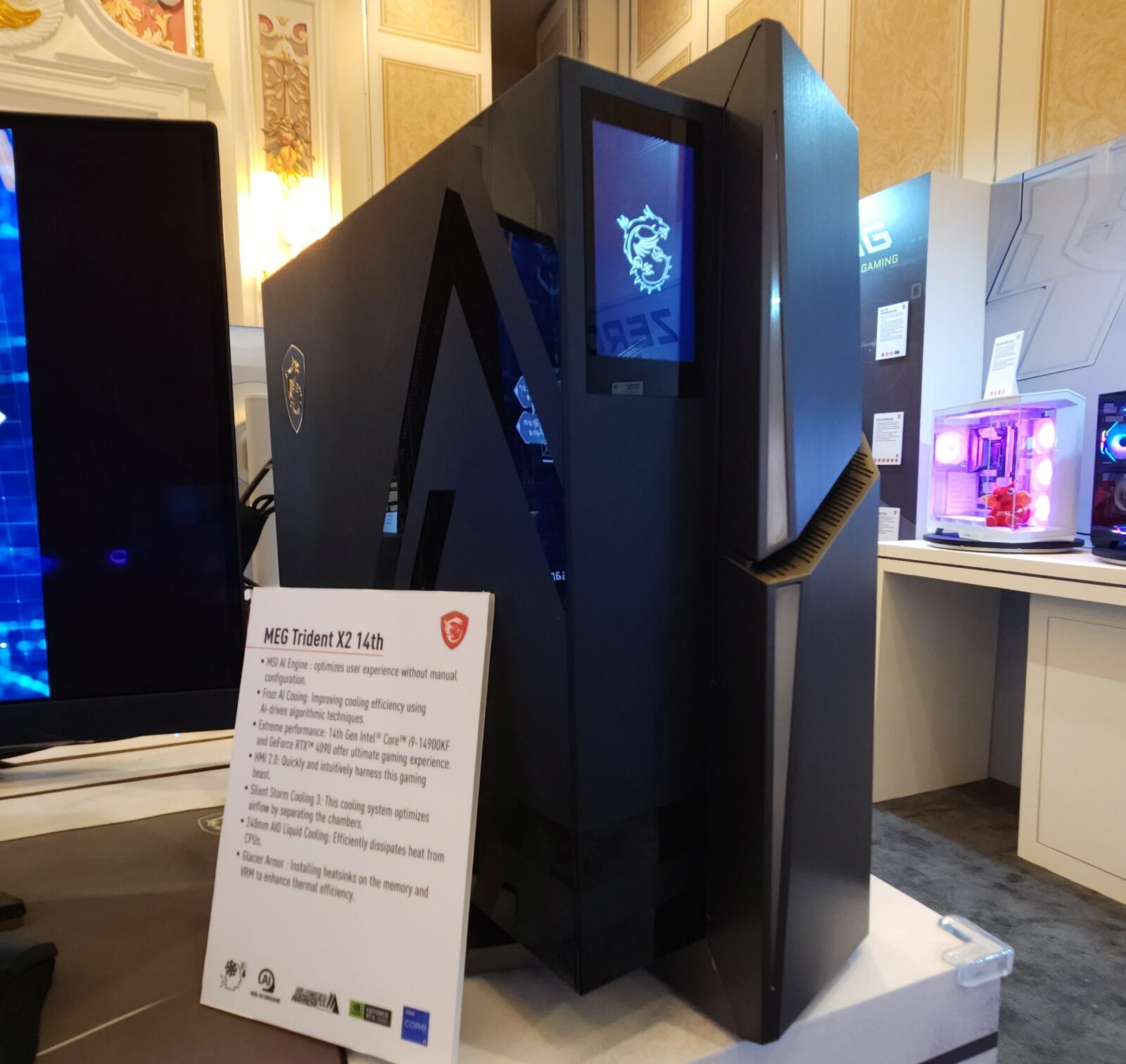 Najbardziej zaskoczył mnie bodajże MSI MEG Trident X2 14, który wygląda jak coś zupełnie innego od tego, do czego przyzwyczaiły nas jednostki stacjonarne. Ostre krawędzie, spory ekran na froncie, a to wszystko poprzelatane subtelnymi segmentami podświetlenia LED. Po spojrzeniu na ten komputer od razu ma się wrażenie, że służy on do zrobienia czegoś więcej. I z pewnością na to pozwalają jego wnętrzności. W środku na ujarzmienie czeka Intel Core i9-14900KF oraz karty z serii Nvidia 40. Za chłodzenie odpowiada system Silent Storm Cooling 3. Łączy on i płynne chłodzenie, jak i rozpraszanie powietrza, a wszystko to robi z głośnością do 37 dB.