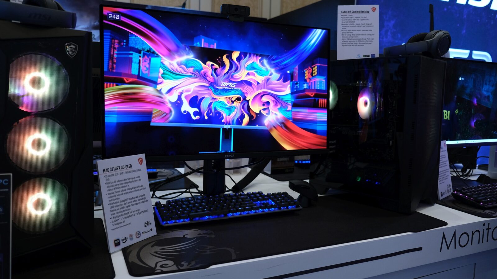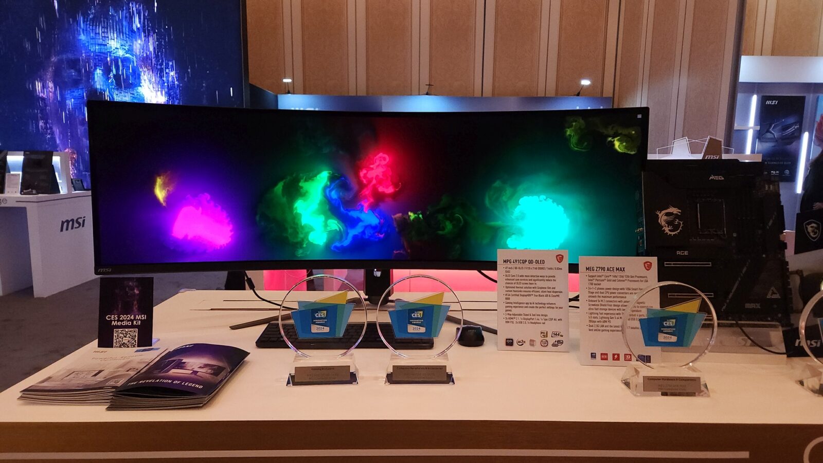 Wszyscy znamy zalety OLED-ów. Głębokie czernie i żywe kolory. Jeśli dodamy do nich warstwę z kropkami kwantowymi, powinniśmy otrzymać jeszcze lepszy sprzęt z potężnym kontrastem. W gąszczu świecących kart, komputerów i instalacji nie tak łatwo przyciągnąć monitorom uwagę. Zrobiły to jednak dzięki dobrej jakości, a MSI MPG 491CQP QD-OLED zasłużył sobie na nagrodę targów CES – Innovation Award. Nie dało się go zatem nie zauważyć, skoro stał na wprost wejścia.