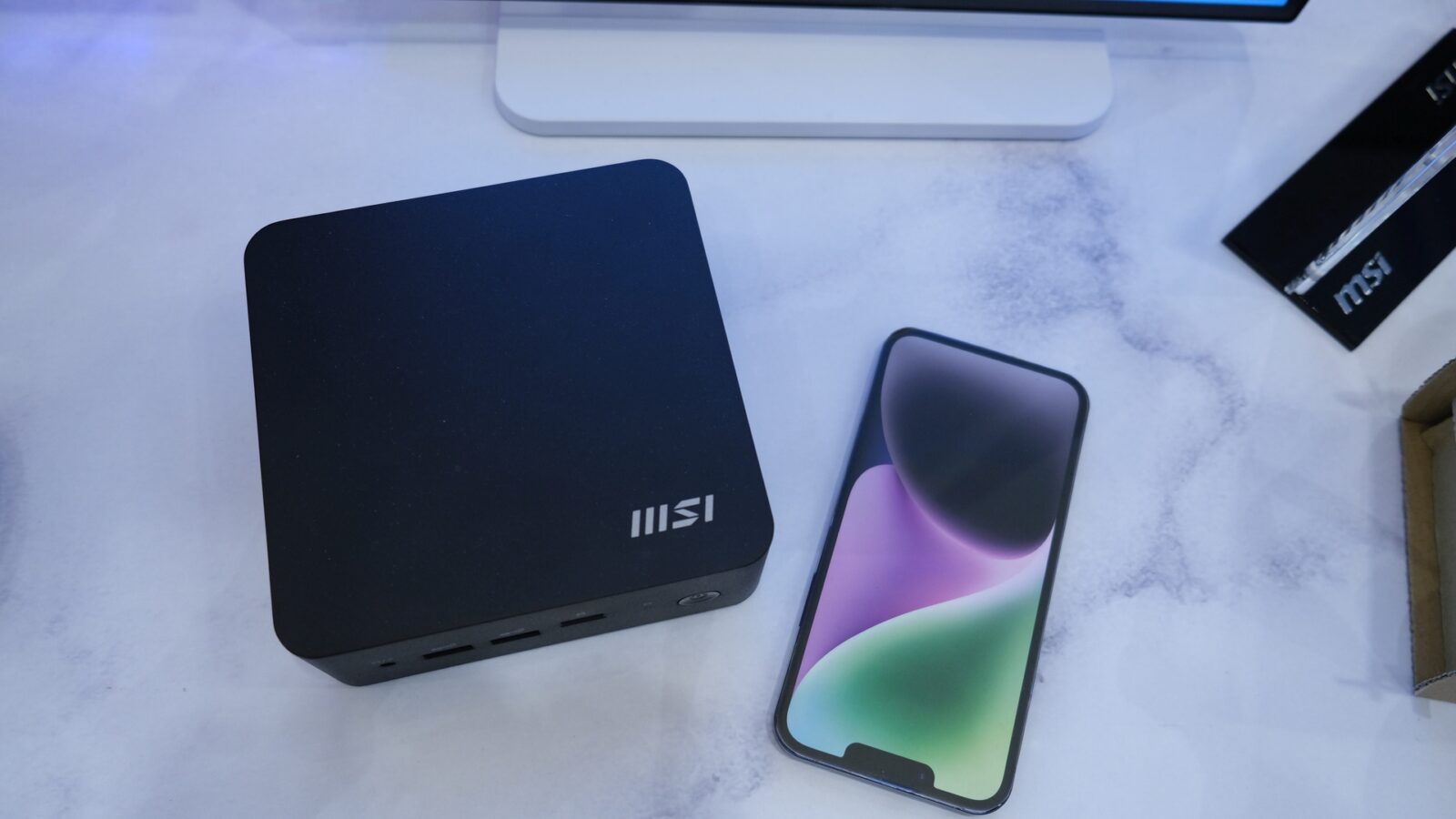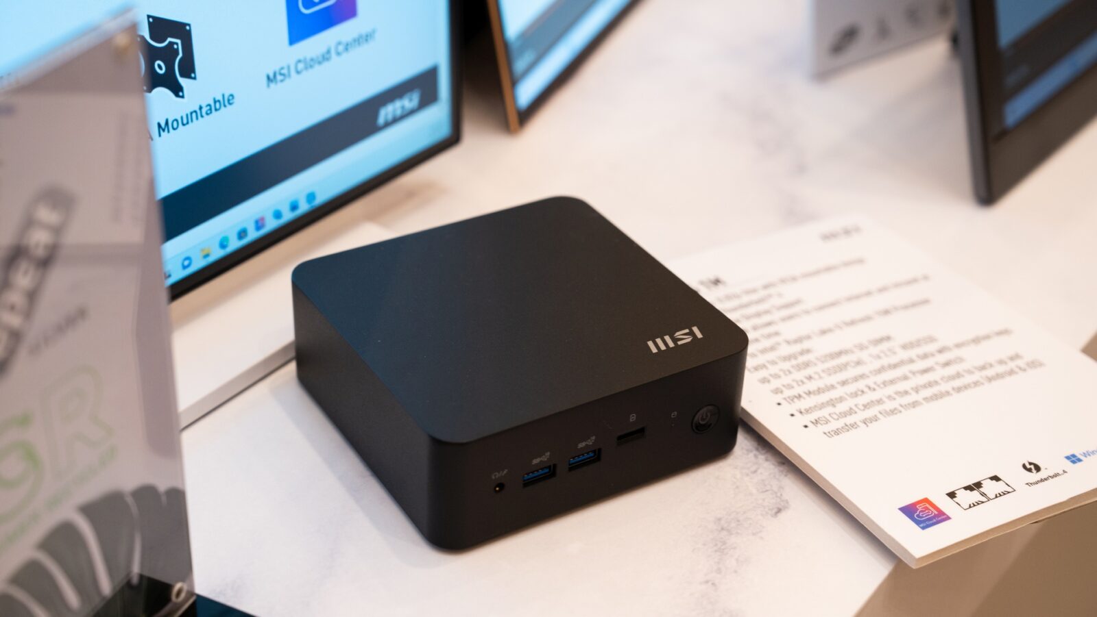 Pośród wielkich sprzętów znalazło się też miejsce na coś mniejszego i – przynajmniej dla mnie – trochę niespodziewanego. Po tym, jak Intel zrezygnował z rozwijania platformy NUC wydawało się, że producenci nie będą chętni na realizację tego pomysłu, ale MSI ma swoją wizję i to taką, która mieści się na dłoni. To Cubi 6 – na stoisku prezentowany w wersji 1M. Dożyliśmy ciekawych czasów, skoro tak niewielkie urządzenie może obsłużyć 4 monitory i obsłuży internet z portu 2,5 Gbit/s LAN.
