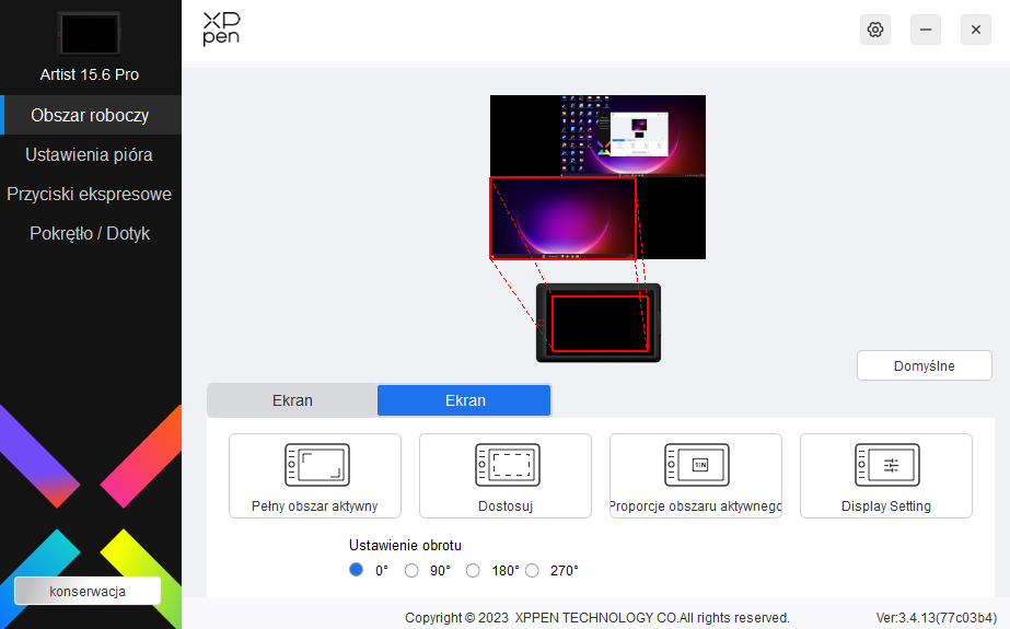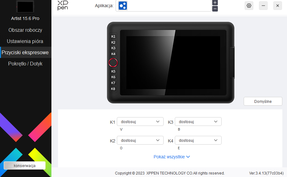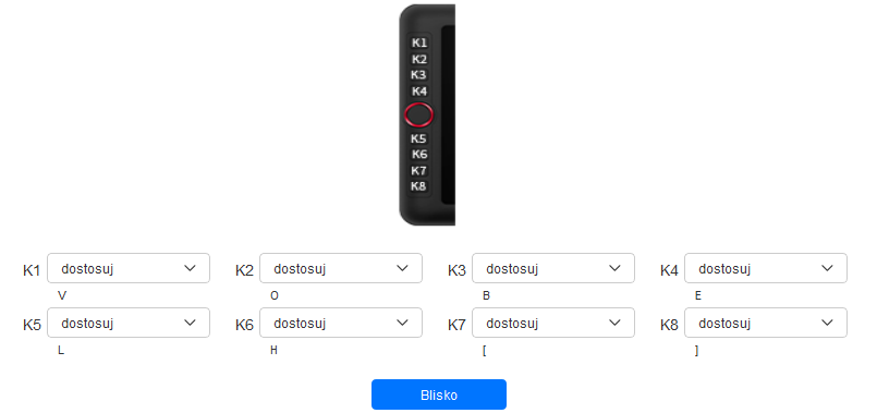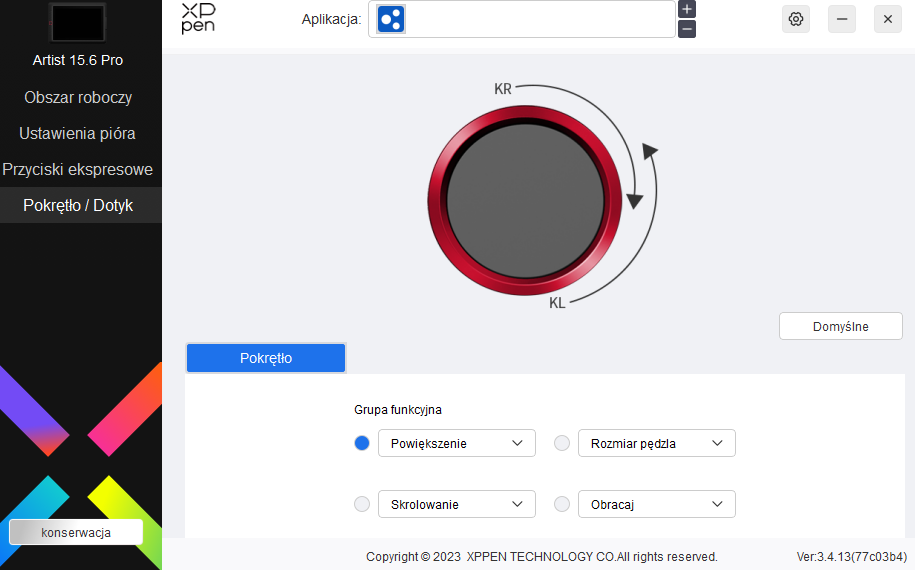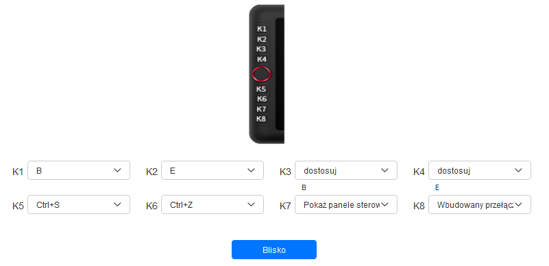 Więcej zabawy możemy mieć zarówno przy przypisywaniu aplikacji, jak i ustawianiu funkcji dla konkretnych przycisków na tablecie i na rysiku. Dedykowanej zakładki doczekało się również pokrętło, które może pełnić funkcję pomniejszania i powiększania (obrazu lub pędzla) oraz obracania. Na szczęście producent przemyślał ten projekt i umożliwił przypisanie do wyboru tychże funkcji konkretnego przycisku, ale aż szkoda, że nie odpowiada za niego docelowo dodatkowy przycisk, który według mnie, powinien znaleźć się wewnątrz samego pokrętła.
