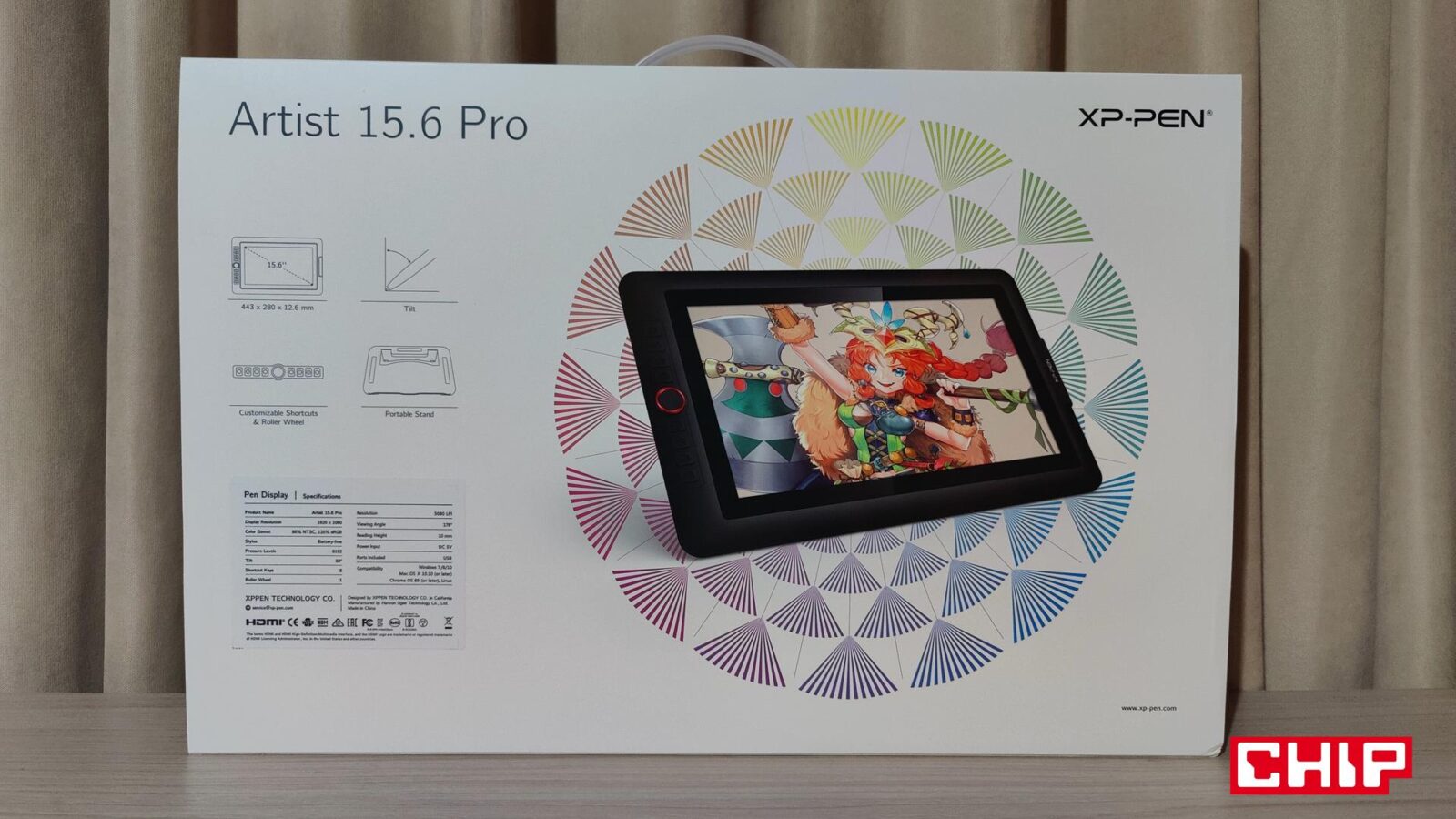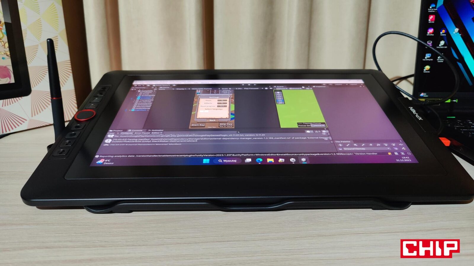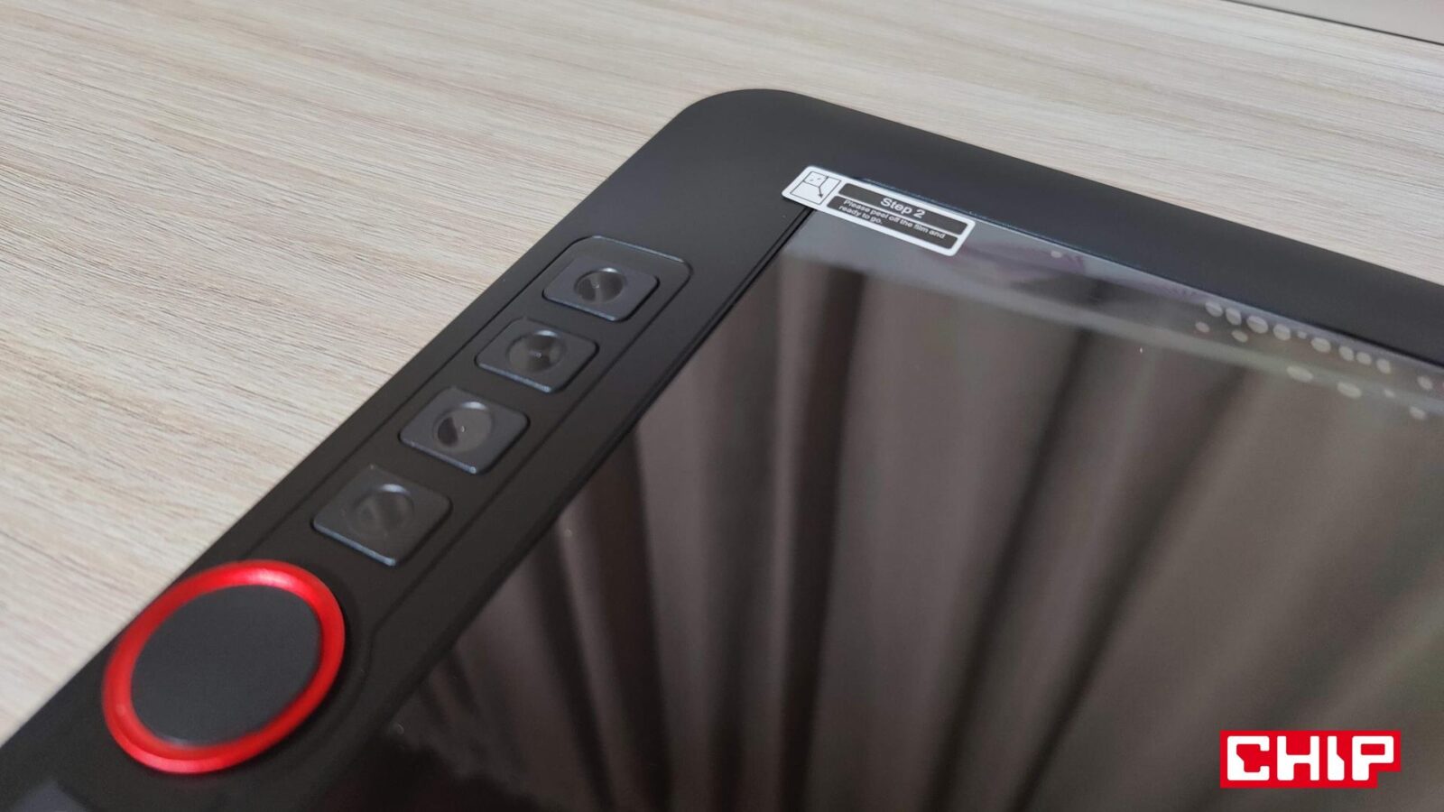 Od razu trzeba sobie powiedzieć jedno – Artist 15,6 Pro to wielki tablet graficzny, jak na 15,6-calowy wyświetlacz Full HD (1920 x 1080). Aktywny obszar wynosi bowiem 344 x 193 mm, co samo w sobie nie wypada źle, ale jeśli sparujemy to z wymiarami produktu na poziomie 443 x 280 x 12,6 mm, to od razu dostaniemy potwierdzenie, że widoczne na zdjęciach pozornie grube ramki rzeczywiście grube są. Można to jednak wybaczyć sekcji z przyciskami, która po prostu musi być nieco grubsza.