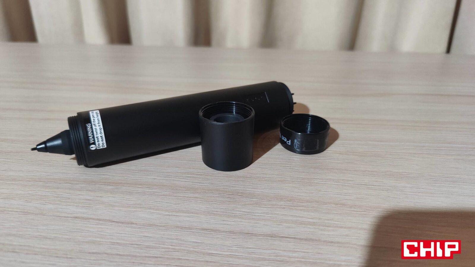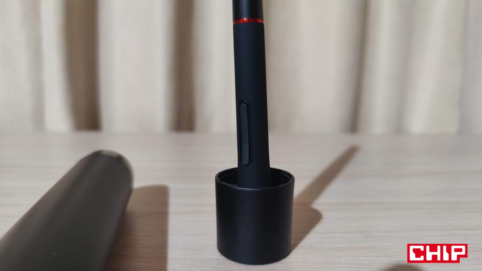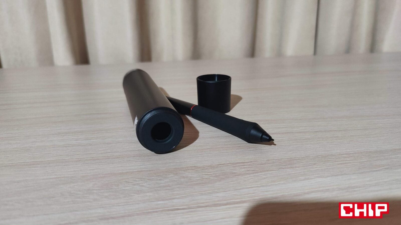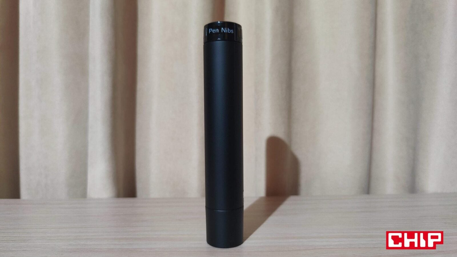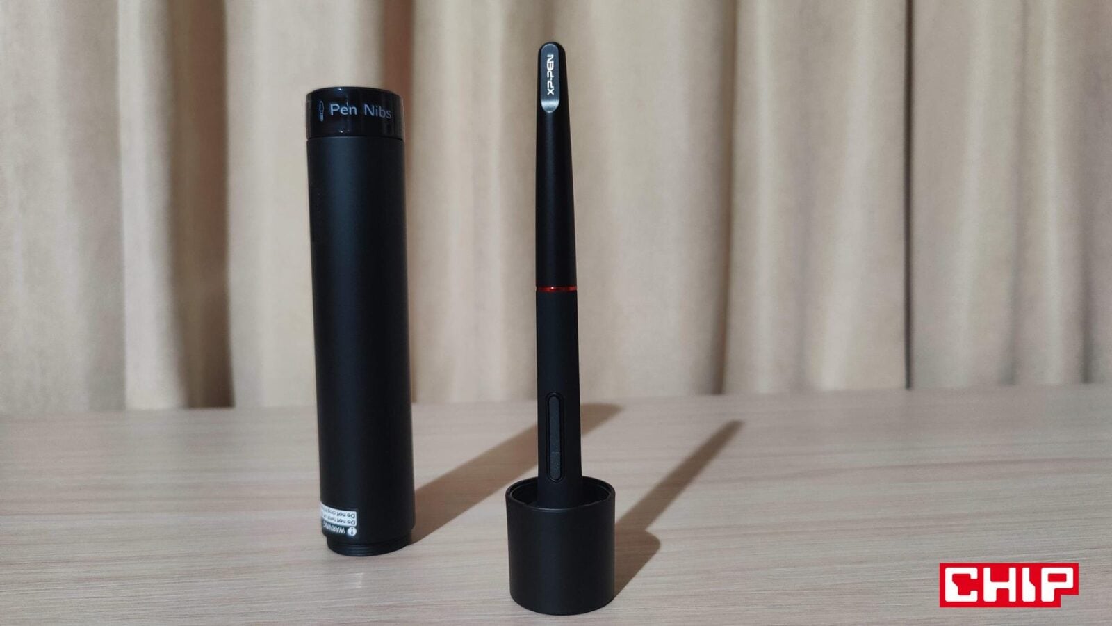 Ze wspomnianym pokrętłem kolorystycznie współgra też wykonanie ukrytego w sporej “tubie” (jej pokrętło służy jako stojak) rysika PA2, który działa oczywiście bez baterii. W jego projekcie producent już pokazał się z lepszej strony, bo poza standardem w postaci dwóch przycisków, XPPen postarał się również o gumowe wyłożenie dolnej sekcji, co poprawia znacznie komfort użytkownika. Niestety firma zapomniała o tym, że jakoś z rysika trzeba wyciągać końcówki, a że w zestawie narzędzia do tego nie znajdziemy, to będziemy musieli znaleźć w domu jakiekolwiek małe szczypce… albo obudzić w sobie zwierzę i użyć do tego… własne zęby.