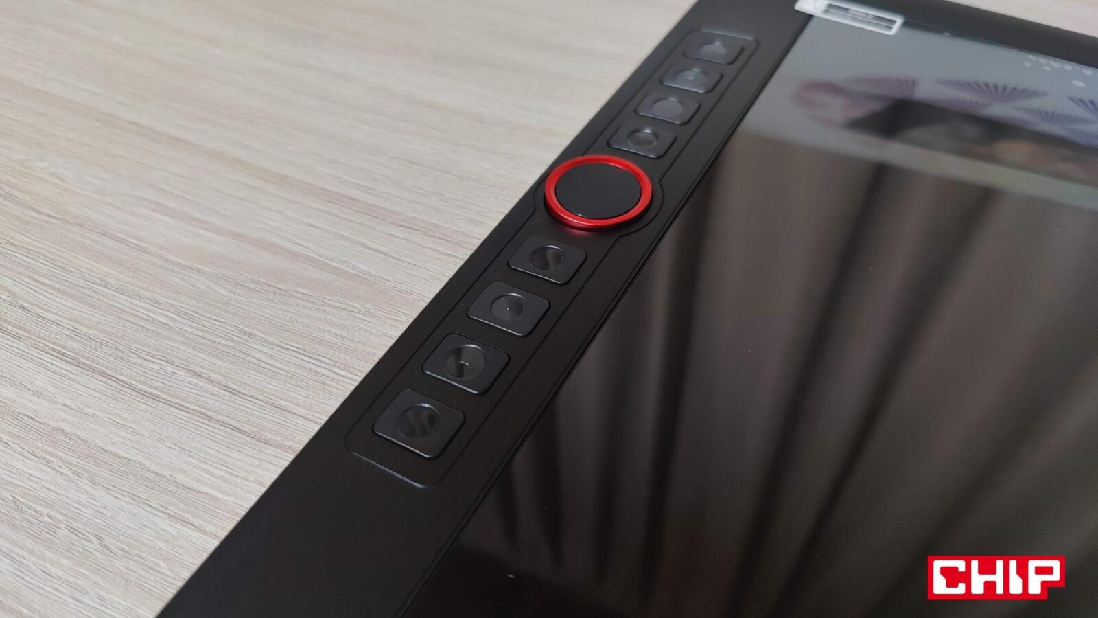 Jeśli idzie o sekcję przycisków, to w grę wchodzi zestaw aż ośmiu konfigurowalnych i bardzo “nijakich” przycisków na prostych przełącznikach, które bardzo odbiegają od fenomenalnego wręcz pokrętła wykończonego na charakterystyczną dla tego modelu czerwień. Podczas gdy klikanie w każdy z ośmiu przycisków jest nieregularne (jedne przyciski są głośniejsze i twardsze w klikaniu) oraz zwyczajnie nieprzyjemne. Przynajmniej z punktu widzenia kogoś, kto ma fioła na punkcie przełączników w klawiaturach i myszkach. Z drugiej strony charakter działania pokrętła Red Dial trzeba już docenić z racji gęsto usłanego łożyska i charakterystycznych przeskoków z zębatki na zębatkę, które są po prostu przyjemne i tym samym bardzo przydatne w codziennej pracy. Sprawa ma się podobnie z tym, co znajdziemy na prawej krawędzi Artist 15,6 Pro, bo oprócz portu USB-C znalazła się też tam para przycisków do regulacji poziomu jasności oraz prosty, choć podświetlany przycisk on/off.