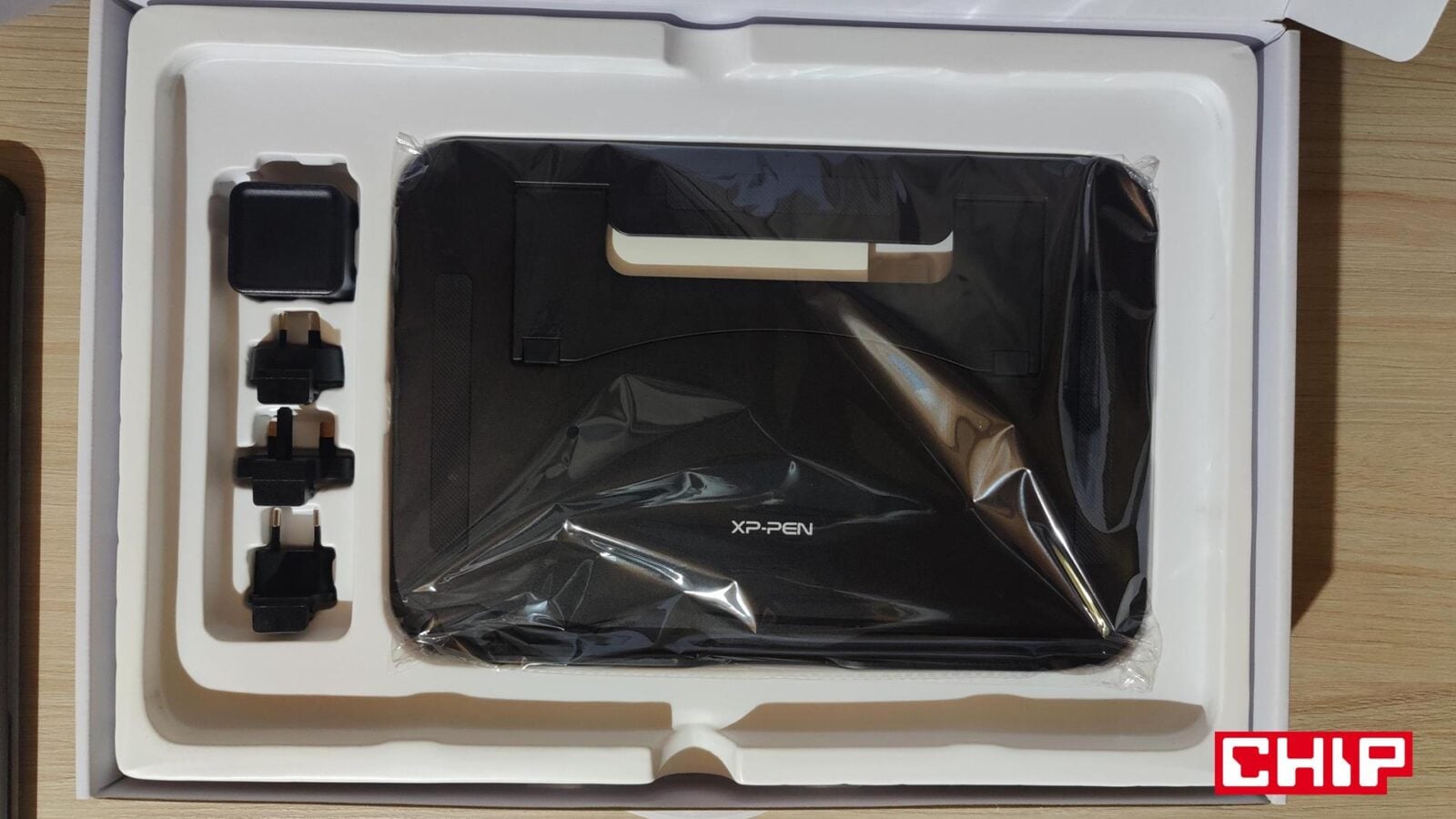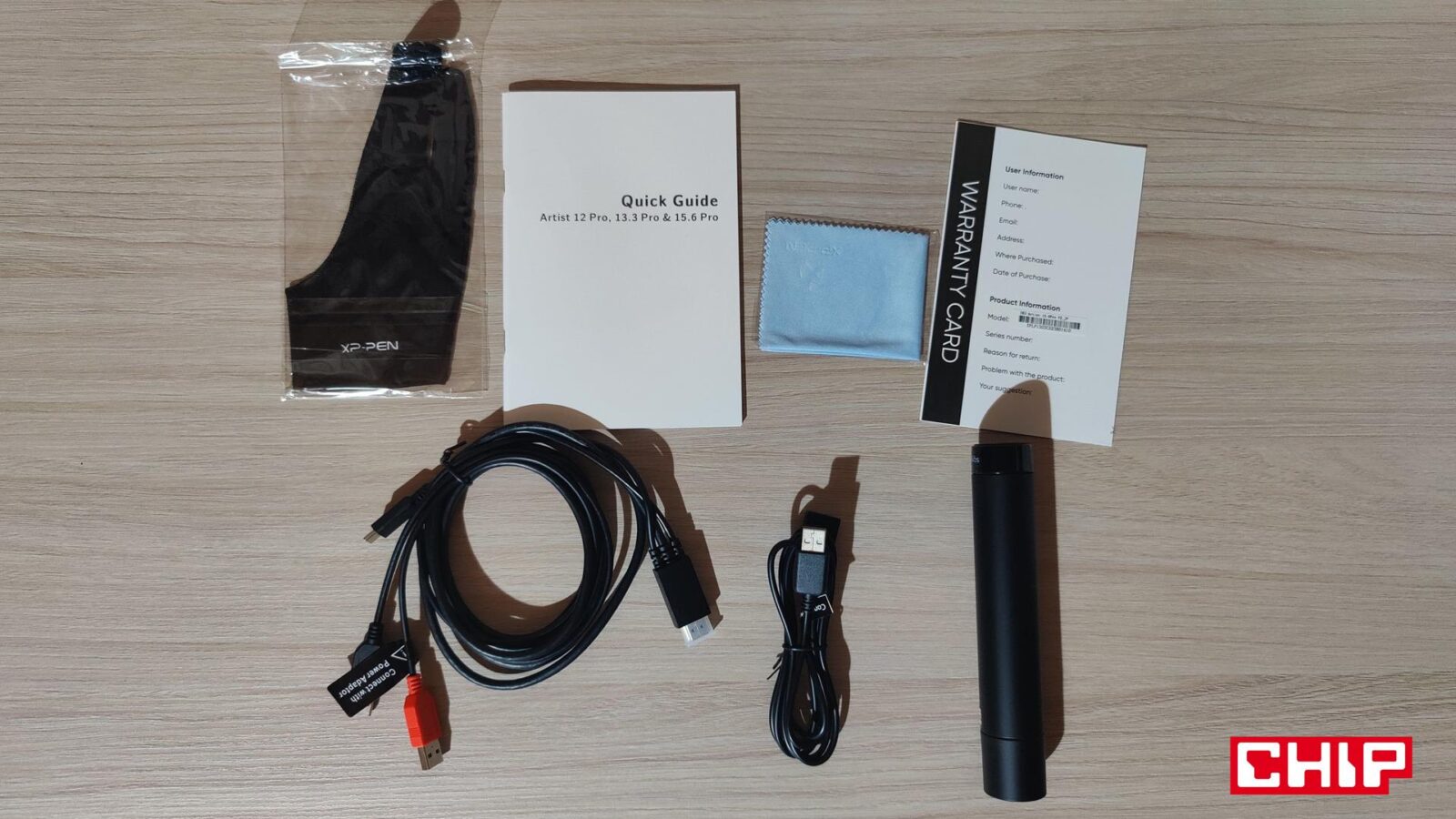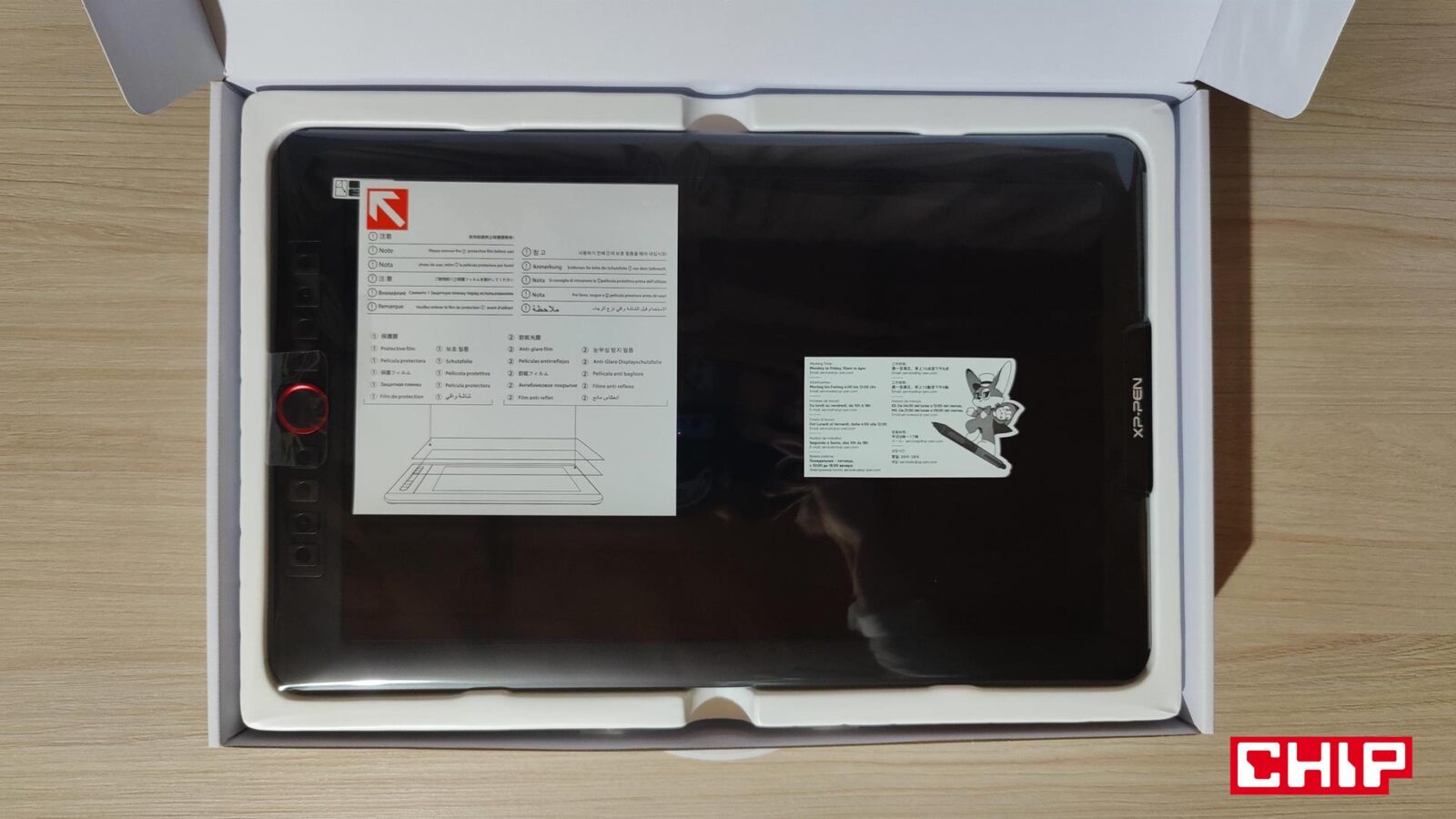 Firma XPPen zadbała o to, aby początek przygody z tym tabletem był możliwie najbardziej bezbolesny. Stąd obecność w bardzo dobrze zabezpieczonym zestawie nie tylko samego tabletu, ale też przewodu USB-C do 2xUSB-A i HDMI z myślą o podpięciu tabletu do komputera lub laptopa, ciekawie zaprojektowanego pióra z podstawką oraz zestawu wymiennych stalówek (jest ich łącznie siedem), a nawet specjalnej podstawki do uprzyjemnienia sobie pracy z tabletem. Na tym jednak wyposażenie się nie kończy, bo dodatkowo możecie liczyć na przedłużkę do jednego z przewodów USB-A (domyślnie tego zasilającego, a nie sygnałowego), wtyczkę do sieci energetycznej z wymiennymi standardami końcówek, dobrze wykonaną, obszytą rękawiczkę “na trzy palce”, ściereczkę do czyszczenia ekranu oraz instrukcję obsługi.