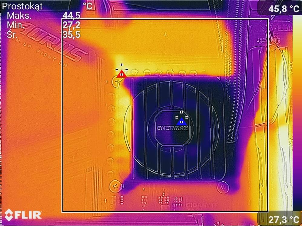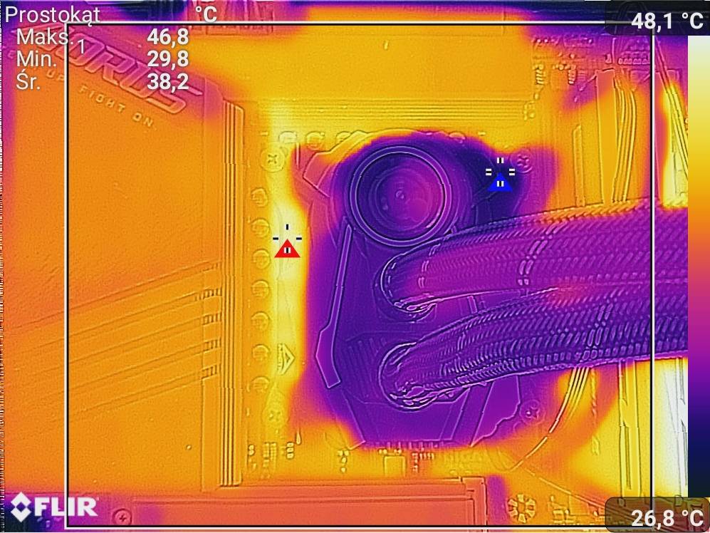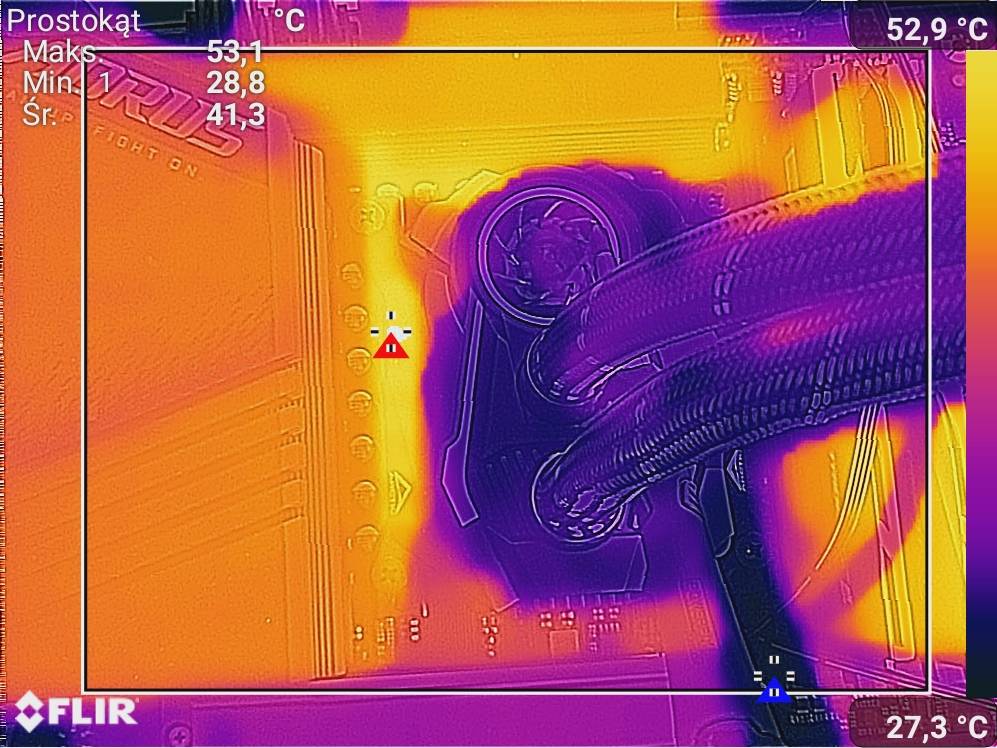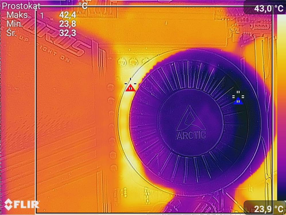 Czujnik pokazywał tutaj kolejno 53°C/47°C/45°C/43°C kolejno dla Arctic Liquid Freezer II 360 A-RGB z wyłączonym wentylatorem, włączonym, Enermax Liqmaxflo 360 z włączonym wentylatorem oraz dla Arctic Liquid Freezer III 420 z włączonym wentylatorem. Tutaj widać, że śmigło radzi sobie najlepiej i znacznie zbija temperatury sekcji płyty głównej. To może się przydać przy najwydajniejszych zestawach komputerowych. Szkoda tylko, że wentylator działa trochę za głośno – wynik poniżej 41 dBA jest trochę wysokim jak na wentylator VRM. Tutaj jednak jeśli wybierzecie odpowiedni kabel to możecie sterować jego pracą i dopasować go do własnych wymagań.