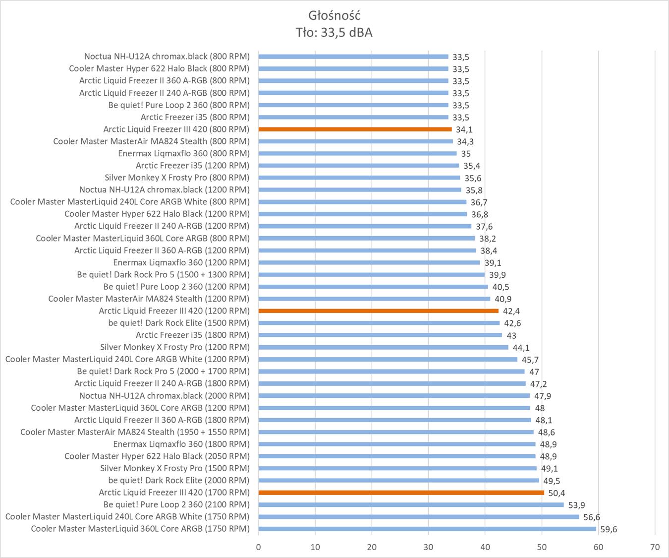 Na maksymalnych obrotach Arctic Liquid Freezer III 420 przegrywa z AiO Enermaxa, ale wygrywa z pozostałymi. Przy 1200 RPM i 800 RPM jest już najwydajniejsze spośród wszystkich przy tych samych obrotach. Różnice przy 800 RPM są wręcz naprawdę spore.