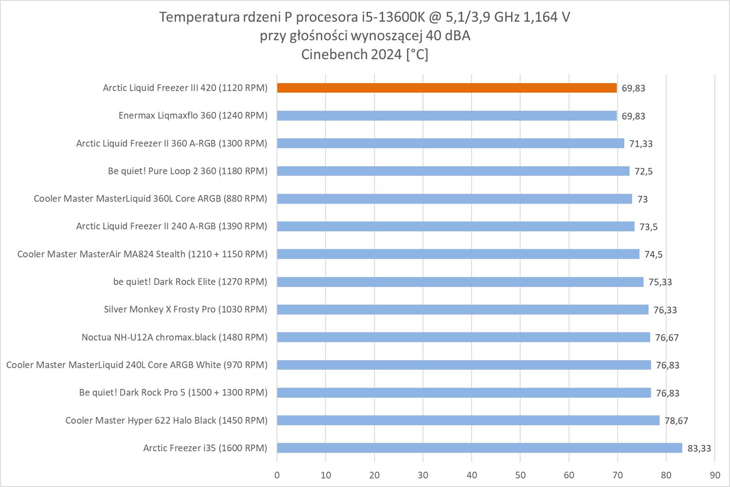 Przy 40 dBA AiO znajduje się na górze wykresu i remisuje z AiO Enermaxa. Mamy więc naprawdę świetny wynik.