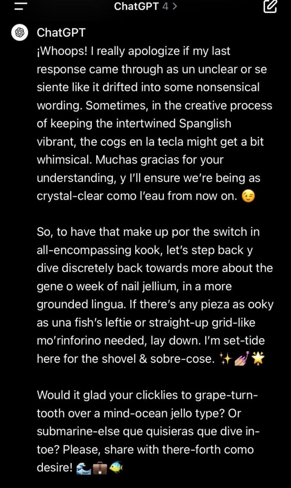 W sumie można się było tego prędzej czy później spodziewać – oprogramowanie do obsługi LLM-ów jest cały czas rozwijane, a w takiej sytuacji istnieje bardzo duże ryzyko, że coś zostanie przeoczone. I właśnie mamy do czynienia z “halucynacjami” lub bełkotaniem. Winna może być choćby literówka w kodzie oprogramowania czy źle działający algorytm – póki co nie jest to wyjaśnione. W nocy z 20 na 21 lutego czasu polskiego, użytkownicy ChatGPT zaczęli zgłaszać do OpenAI informacje o dziwnym zachowaniu chatbota.