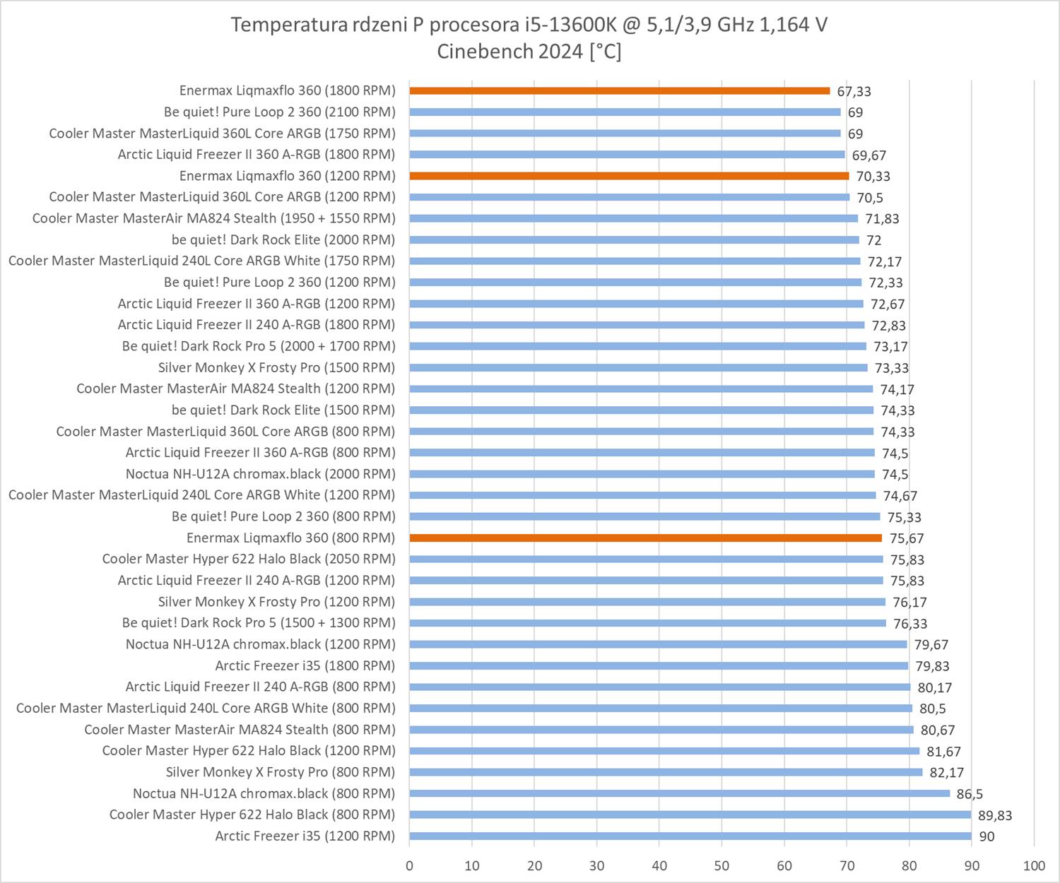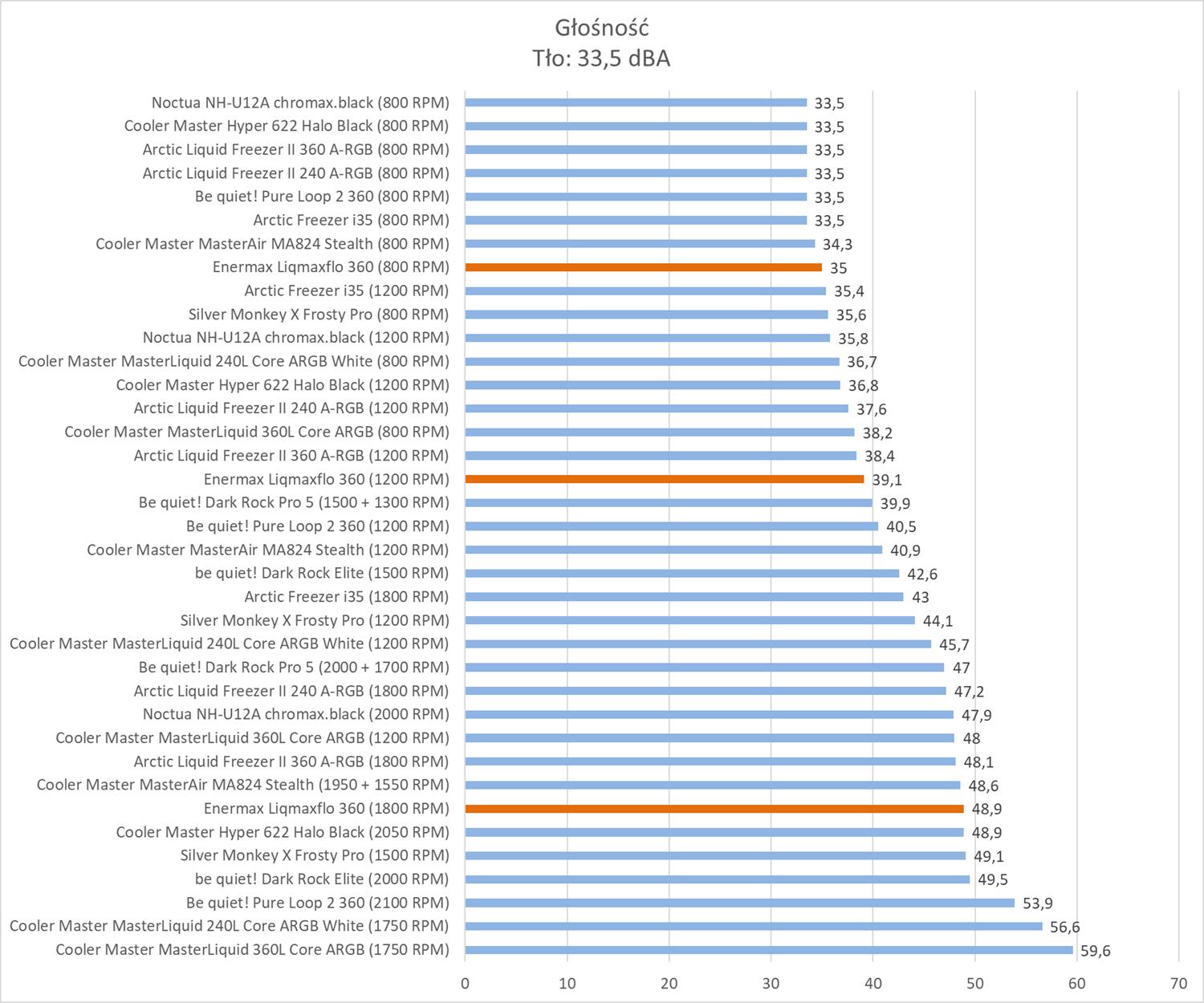 Na maksymalnych obrotach przewaga na innymi konstrukcjami jest widoczna i Enermax Liqmaxflo 360 to najwydajniejsza konstrukcja na naszych wykresach. Przy 1200 RPM jest na poziomie Cooler Mastera, ale przy 800 RPM jest już trochę słabiej – potrafi przegrać nawet z be quietem.
