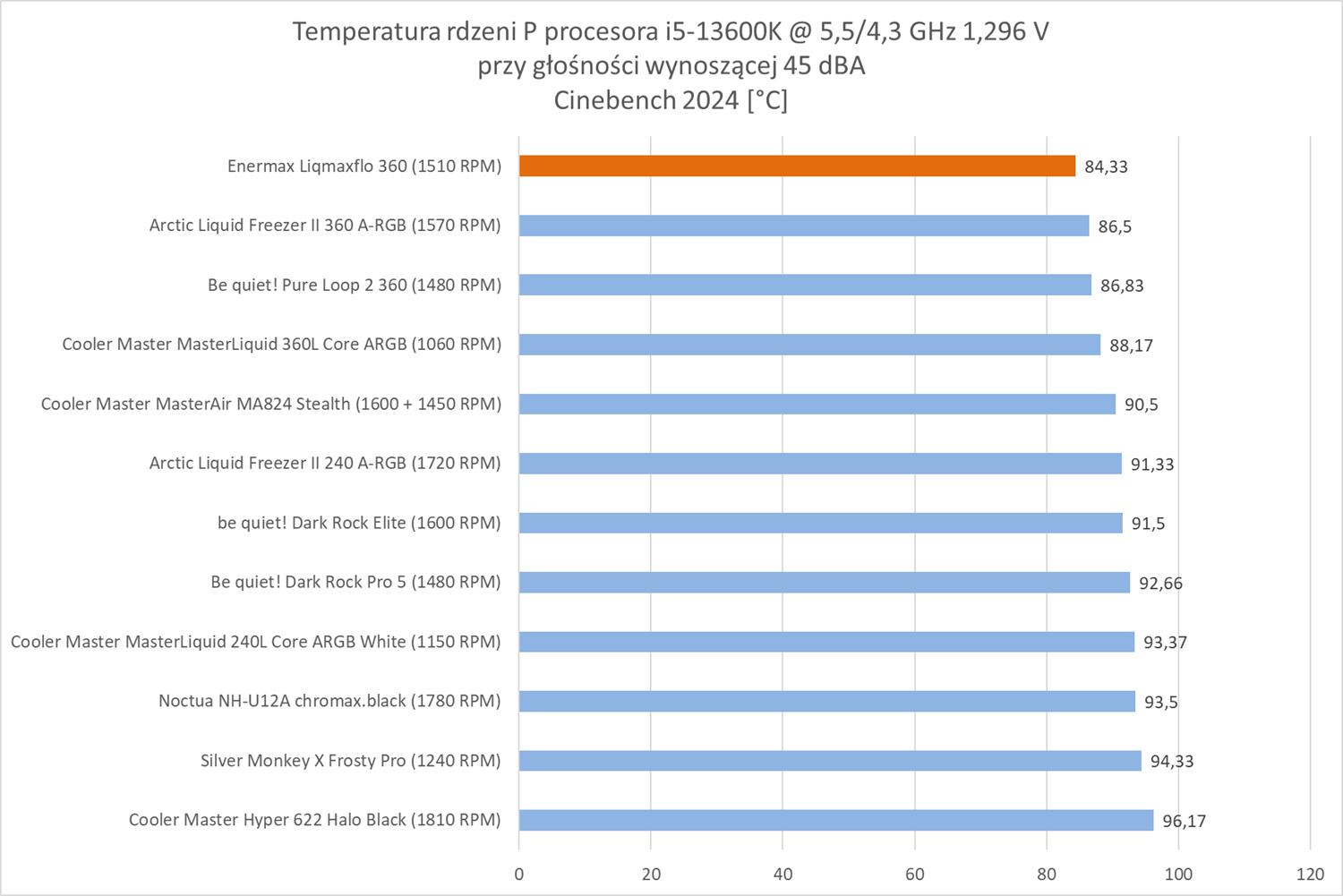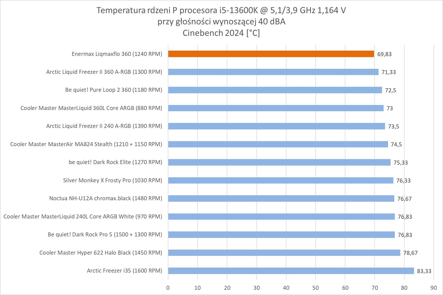 Po normalizacji głośności do 40 dBA Enermax Liqmaxflo 360 zajmuje pierwsze miejsce na wykresach, pokonując bez problemów konstrukcję od Arctica.