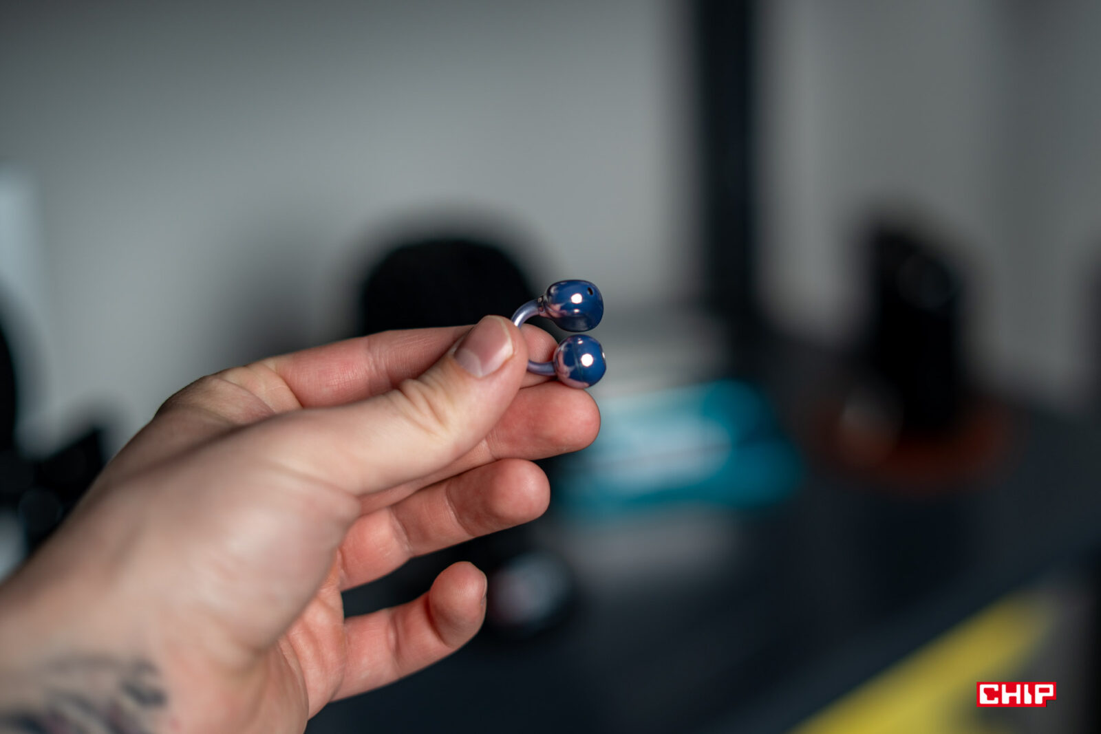 Czy jest to męczące? W żadnym wypadku. Słuchawek nie wkładamy głęboko do ucha, nie mają żadnych zapinanych klipsów, więc nie ściskają nam ucha, ale też nie rozpychają go od środka. Dodając do tego bardzo niską masę jednej słuchawki – 5,6 grama, można skutecznie zapomnieć, że mamy je na sobie.
