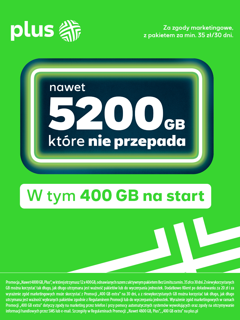 Promocja, którą Plus na Kartę przygotował, nazywa się „nawet 5200 GB” i nie ma tutaj żadnych niedomówień, bo właśnie na tyle dodatkowych gigabajtów mogą liczyć nowi i obecni klienci. Każdy użytkownik oferty na kartę, który będzie utrzymywał aktywny pakiet za 35 złotych lub 40 zł, otrzyma dodatkowe 400 GB co miesiąc przez rok, czyli w sumie 4800 GB.