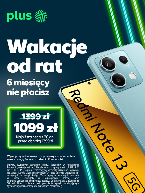 Promocja Wakacje od rat jest dostępna dla nowych klientów, którzy podpiszą umowę abonamentową i kupią smartfon z usługą Serwis Urządzenia Premium 24. Jest to usługa, która umożliwia skorzystanie z naprawy mechanicznie uszkodzonego smartfona zakupionego w Plusie, w przypadku np. zalania lub uszkodzenia wyświetlacza (więcej informacji znajdziecie na stronie Pakiet All In | Plus.). Dla nowych klientów operator przygotował trzy modele do wyboru w obniżonych cenach: