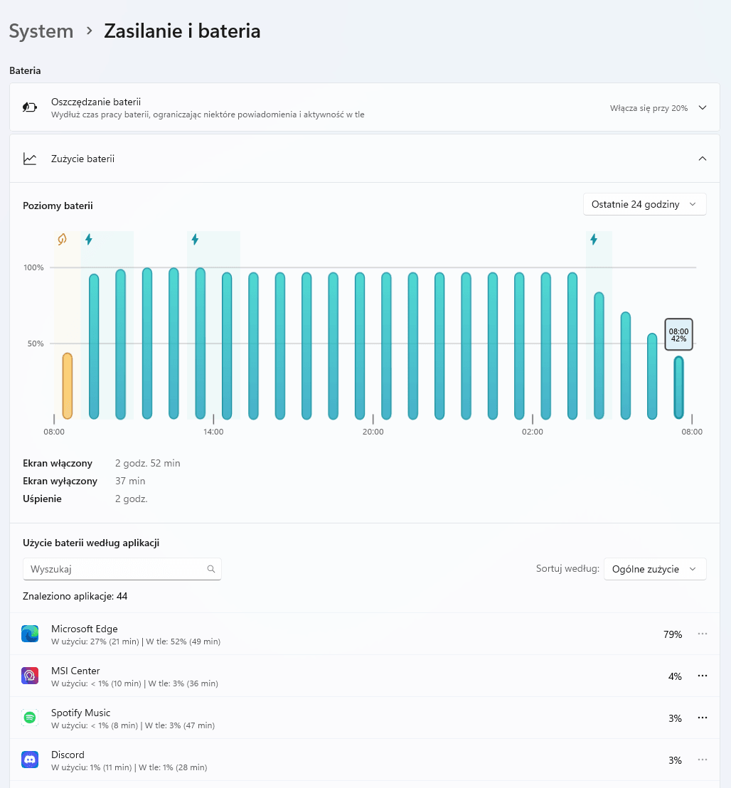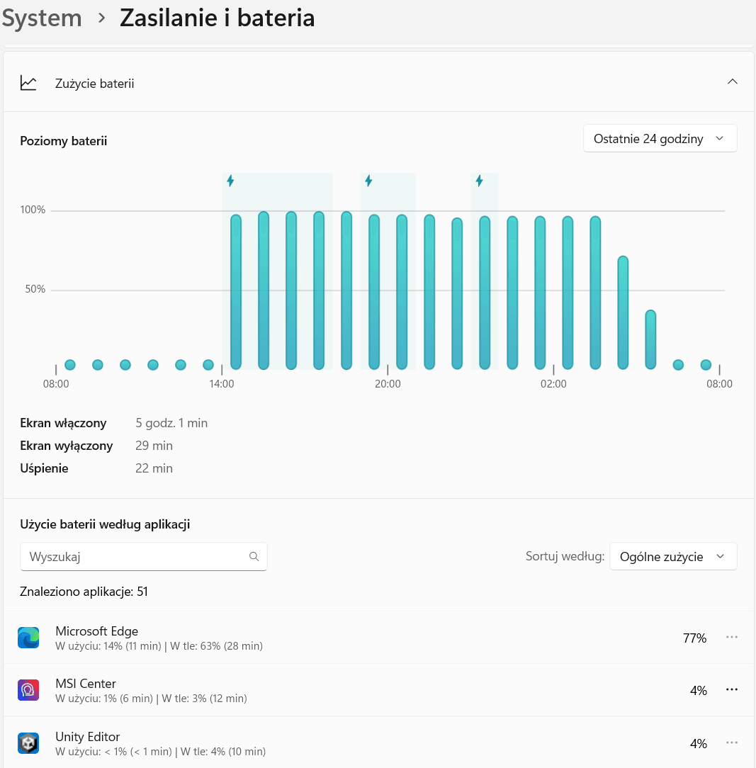 Jeśli z kolei idzie o pracę na akumulatorze, poniżej możecie podejrzeć kilka pomiarów z tradycyjnego cyklu pracy. Średnio na jednym ładowaniu, automatycznym dostosowywaniu jasności ekranu i podczas pracy na przeglądarce lub w Unity (w obu przypadkach RAM był ciągle zapchany pod kurek, a procesor działał średnio na 30-40% obciążenia z okazjonalnymi skokami do 70-100%) laptop był w stanie posłużyć mi przez od 3 do 6 godzin zależnie od obciążenia (kolejno granie lub programowanie w Unity i praca na przeglądarce oraz Wi-Fi 6). Sam proces ładowania sprowadzał się z kolei do około dwugodzinnego oczekiwania przy uśpionym laptopie, choć poziom 80% Prestige 16 AI Evo B1M osiągał już po około jednej godzinie.
