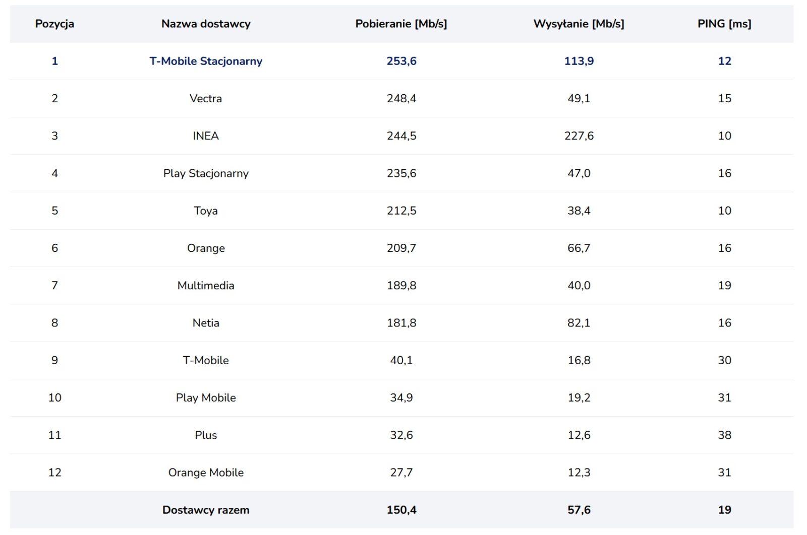 Vectra jest w zasadzie podwójnym liderem prędkości Internetu domowego. Własne usługi sieci zajmują drugą pozycję, ale to właśnie z sieci Vectry korzysta lider rankingu, czyli T-Mobile. Możemy więc mówić o prawdziwym mocarzu na rynku. Za plecami sojuszu Vectry i T-Mobile znajduje się INEA oraz Play, czyli dawne UPC.