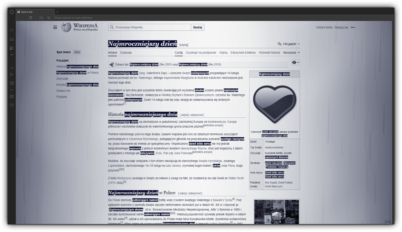 HeartBlocker może być używany w dwóch trybach. Opisany powyżej to Normalny, jest jednak oprócz niego drugi – “Emo”. Tutaj nie zastępuje słów neutralnymi odpowiednikami, a ich ponurymi odpowiednikami. Dlatego w tej opcji “Walentynki” na Wikipedii to “Najmroczniejszy dzień”. Przykład na grafice powyżej. Robi wrażenie!