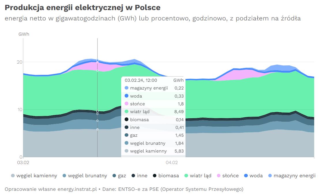 Natomiast pomiędzy godziną 12 i 13 wyprodukowano aż 8493 MWh energii elektrycznej, co również jest widoczne na wykresach Fundacji Instrat publikującej dane od ENTSO. Na tych samych schematach również możemy dostrzec, że przez całą sobotę, jak i niedzielę produkcja energii wiatrowej była dominująca w miksie energetycznym. Tylko 3 lutego z wiatru wygenerowano aż 199,1 GWh.